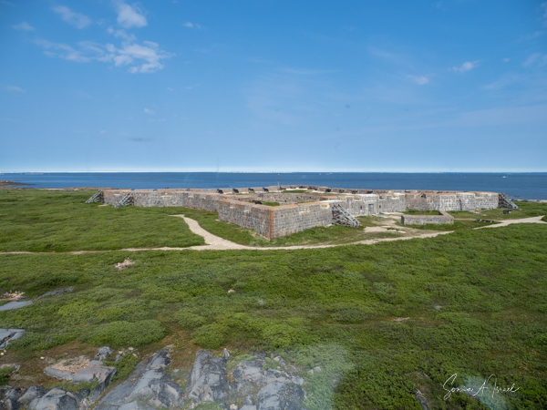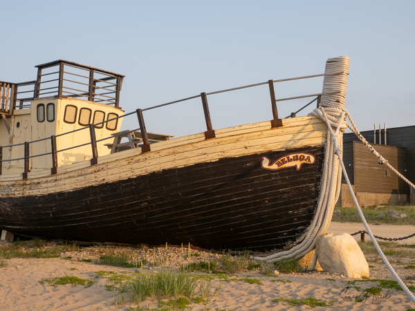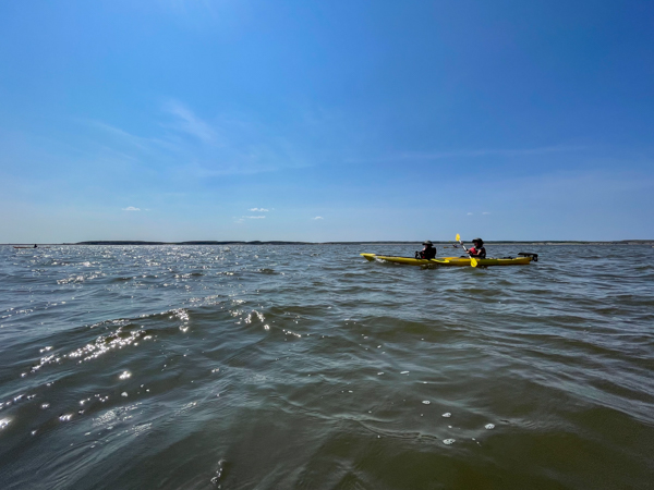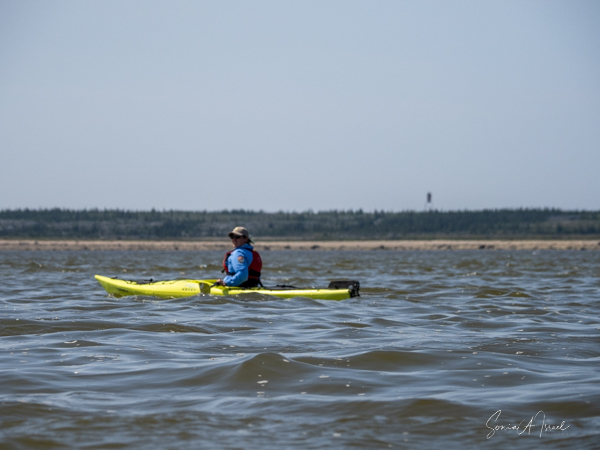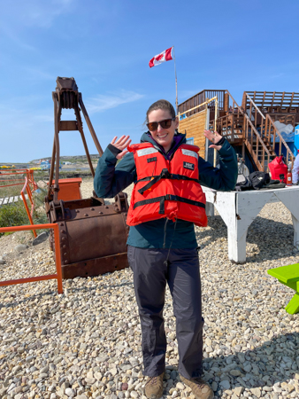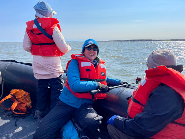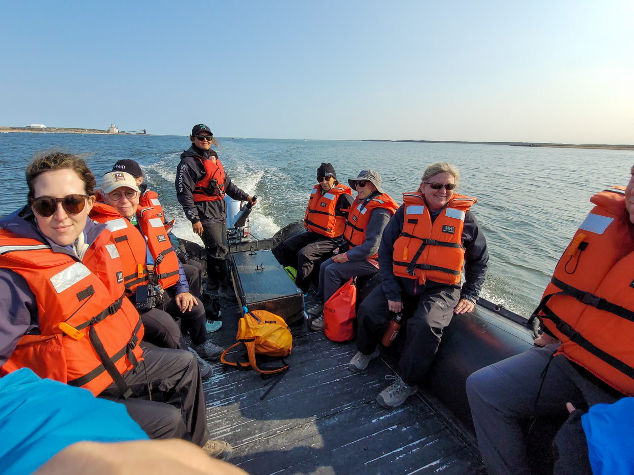 We all settled in and Emma guided us out of the harbor into the estuary, and headed towards the point closer to the fort and at the mouth of the river. We crossed over the Manitoba–Nunavut border. We of course were looking for more belugas, but Emma saw another boat closer to shore.