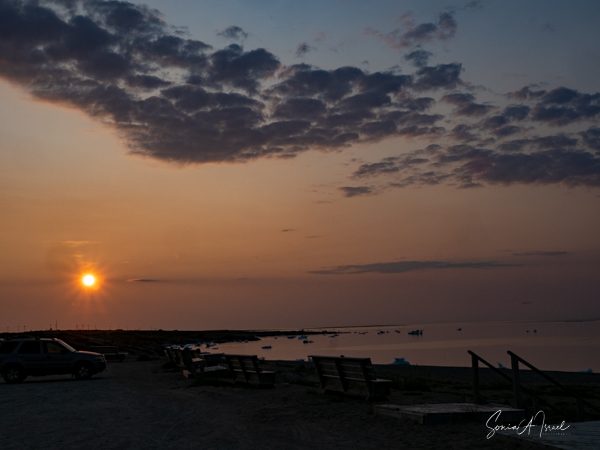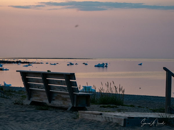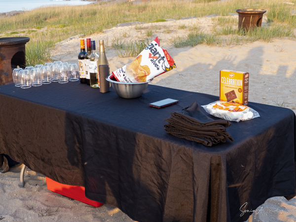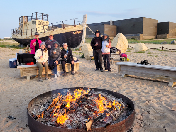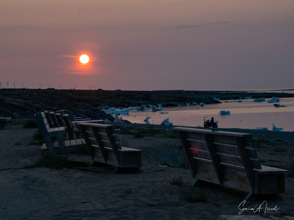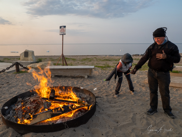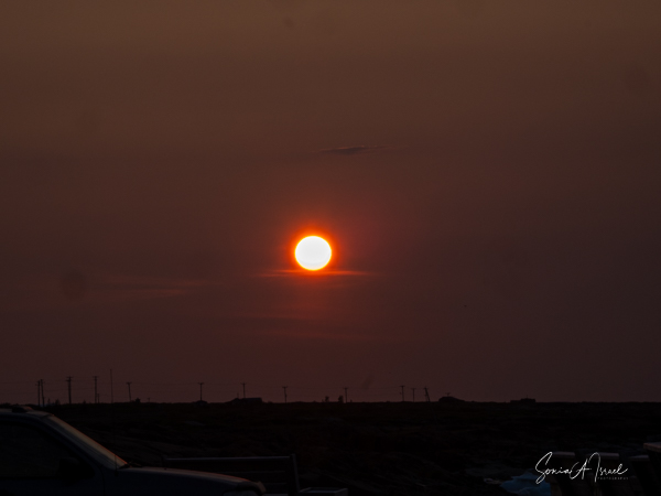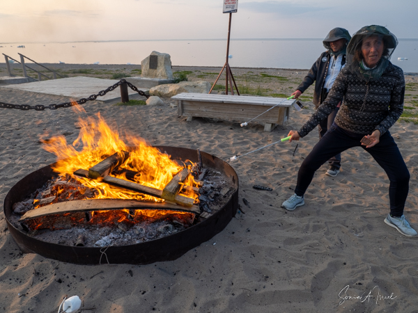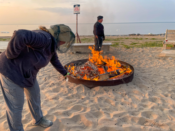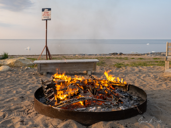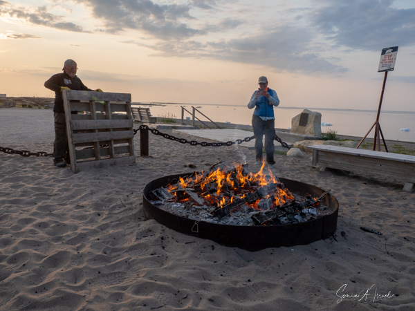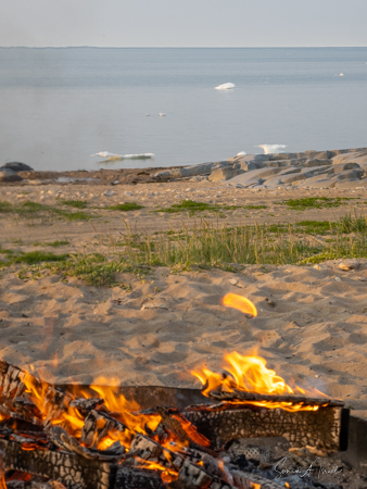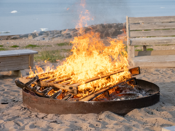 After that amazing and exhilarating ride and sightings, we drove over to the beach for a bonfire, smores and sunset. As we looked out over the water, we could see a fata morgana, a mirage visible in a narrow band right above the horizon. The name fata morgana comes from the Italian name of a sorceress, Morgan le Fay (or Morgan the Fairy) and it was believed that these mirages were fairy castles in the air air conjured by her magic. This mirage was really ice that looked like land.