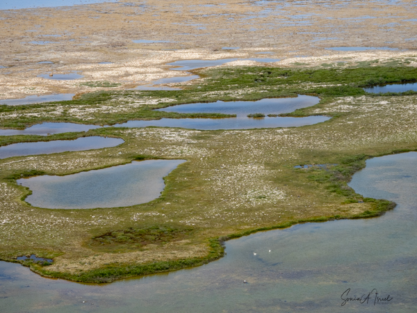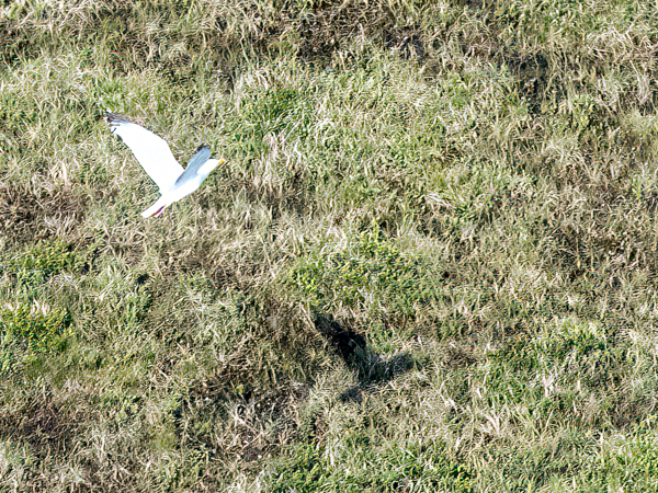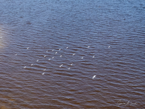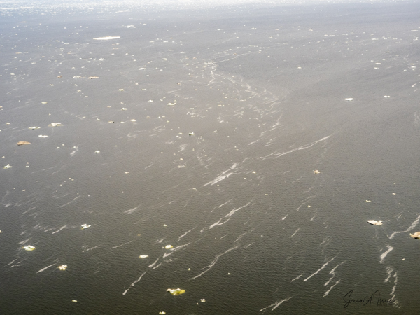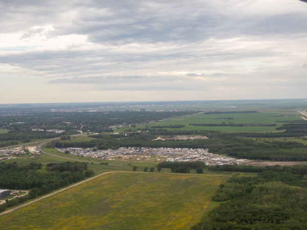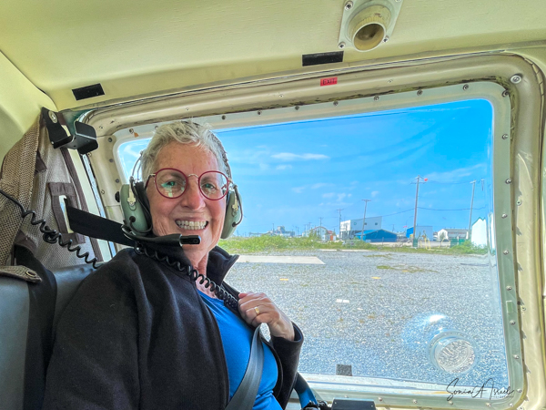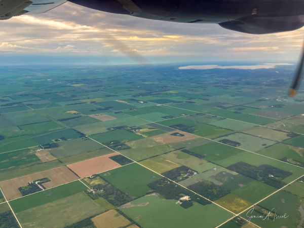 We could see the whole town from the sky as well as much of the Hudson Bay territory. We flew over the water and over the land, much of which looked almost like swamp without the greenery. There were pools of water, shining and reflecting the sun. There were birds flying everywhere – under us.