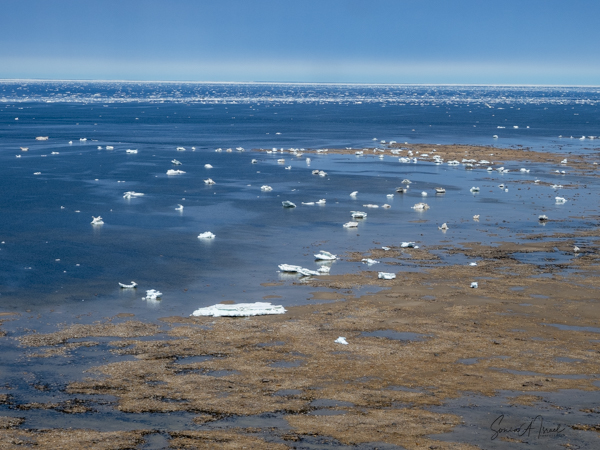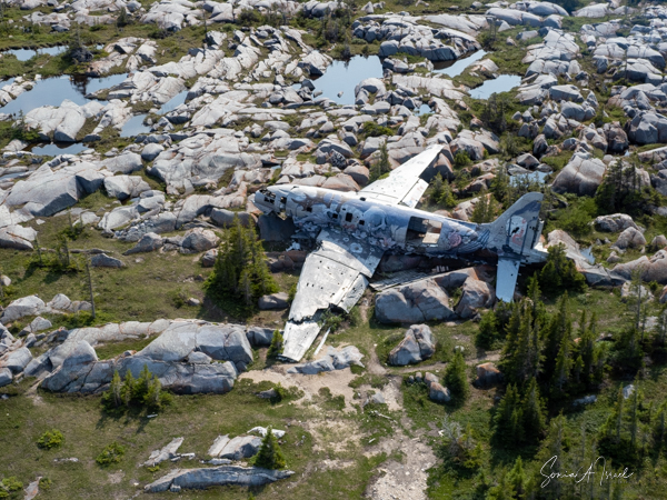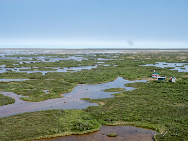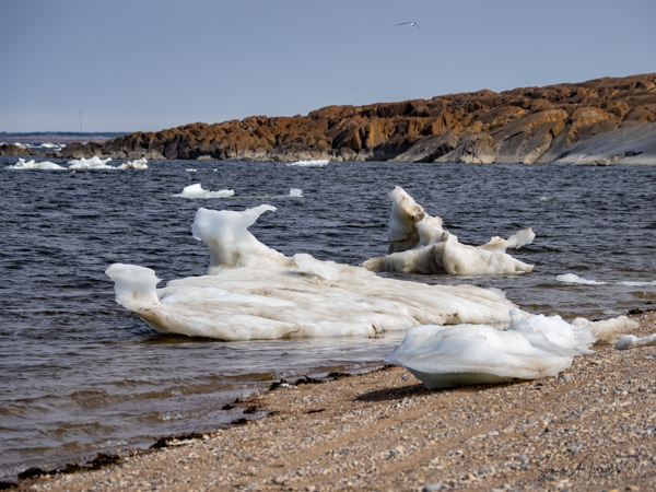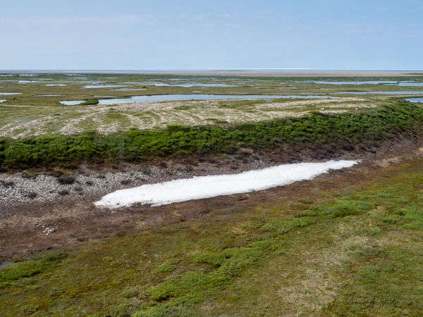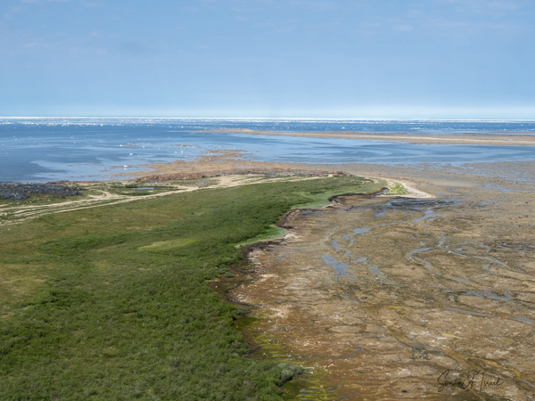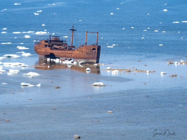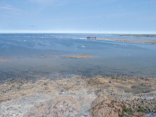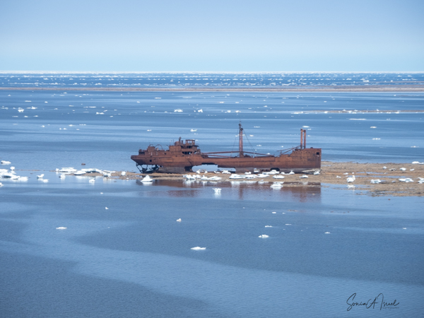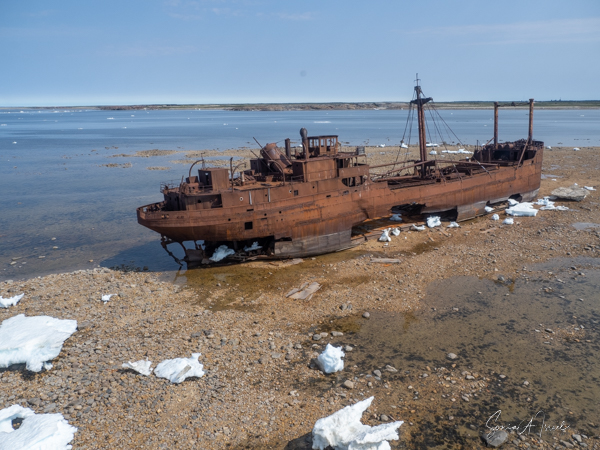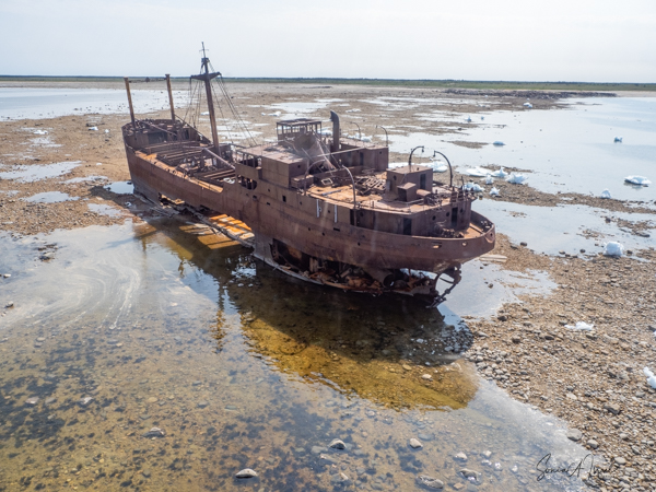 We flew over the wreck of the MV Ithaca, at the western tip of Bird Cove. It is said that in 1961, the ship, carrying nickel ore from Rankin Inlet to Montreal, ran aground during a big windstorm. But of course, there is more than one story. A second tale is that in 1960, the ship was carrying supplies from Churchill to Rankin Inlet and broke its rudder, running aground. Yet a third story is a combination of the two suggesting that shortly after leaving port from Churchill, heading to Rankin Inlet, the ship, carrying electrical generators and plywood, broke its rudder in an 80-mile an hour gale and ran aground. No one knows the true story. As we were heading out flying over the wreck, the tide was low and we could see the whole ship. On our way back, as the tide was rising, it was slowly being covered with water.