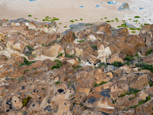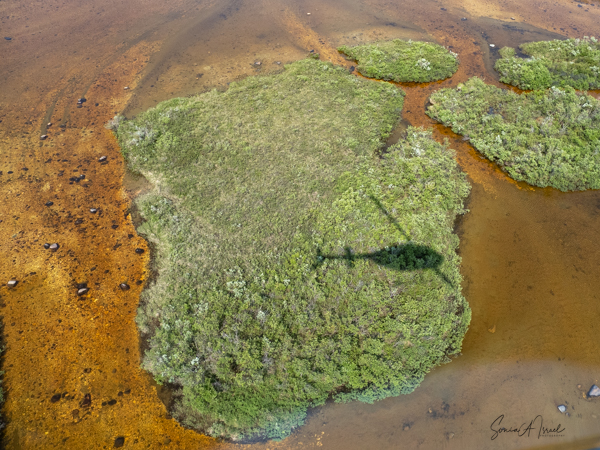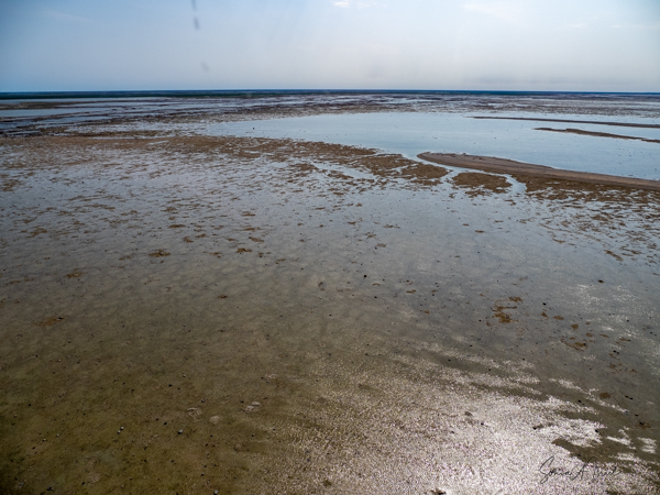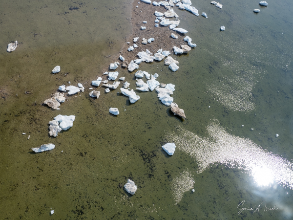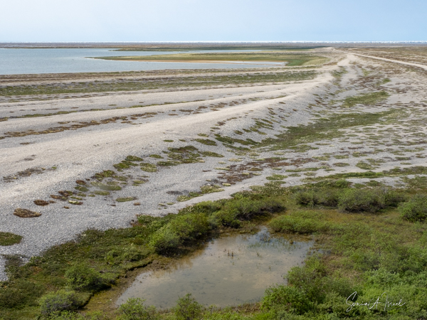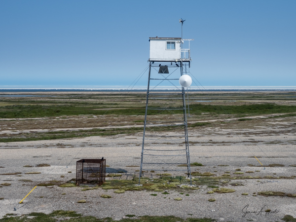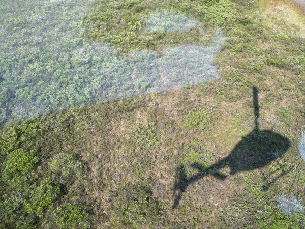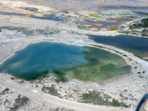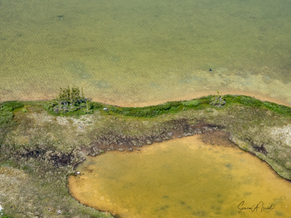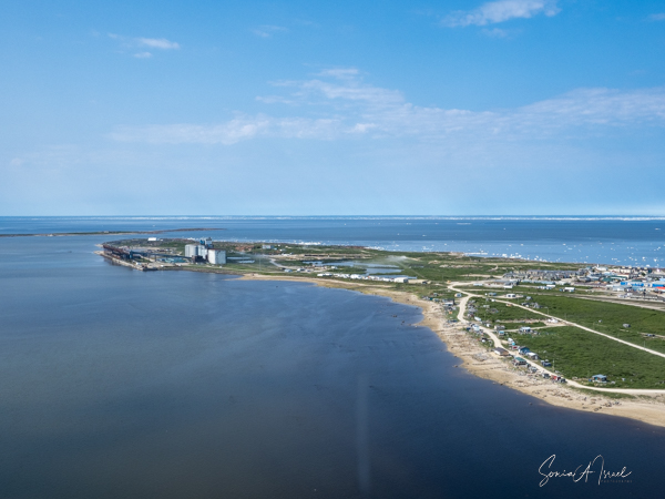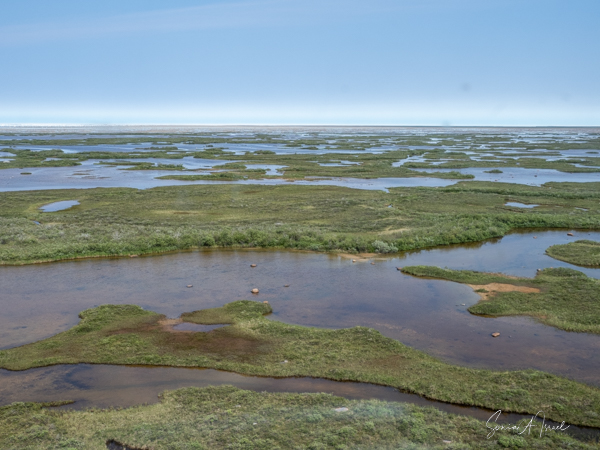 We flew over the wreck of the MV Ithaca, at the western tip of Bird Cove. It is said that in 1961, the ship, carrying nickel ore from Rankin Inlet to Montreal, ran aground during a big windstorm. But of course, there is more than one story. A second tale is that in 1960, the ship was carrying supplies from Churchill to Rankin Inlet and broke its rudder, running aground. Yet a third story is a combination of the two suggesting that shortly after leaving port from Churchill, heading to Rankin Inlet, the ship, carrying electrical generators and plywood, broke its rudder in an 80-mile an hour gale and ran aground. No one knows the true story. As we were heading out flying over the wreck, the tide was low and we could see the whole ship. On our way back, as the tide was rising, it was slowly being covered with water.