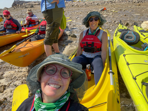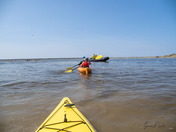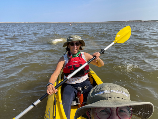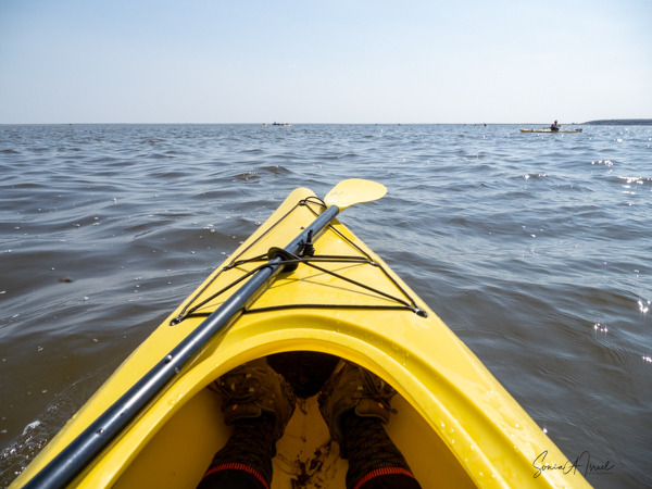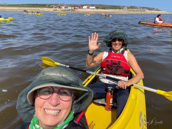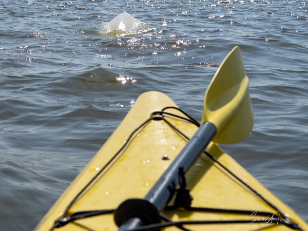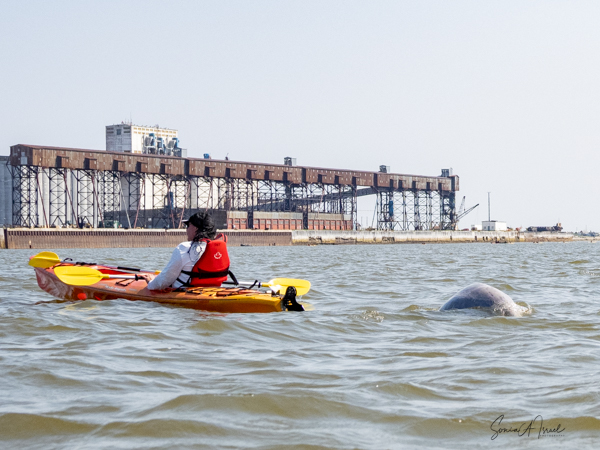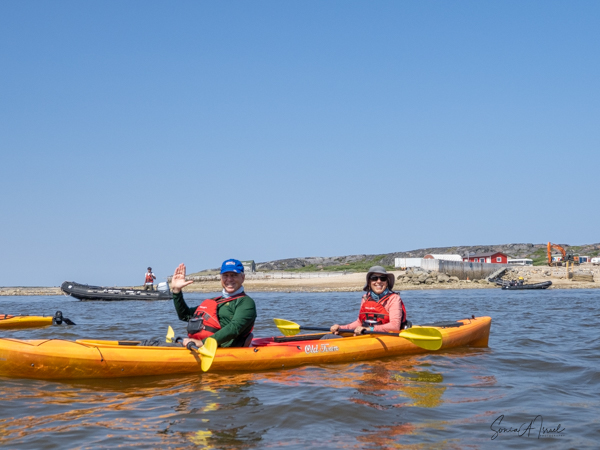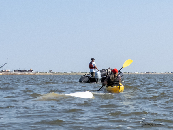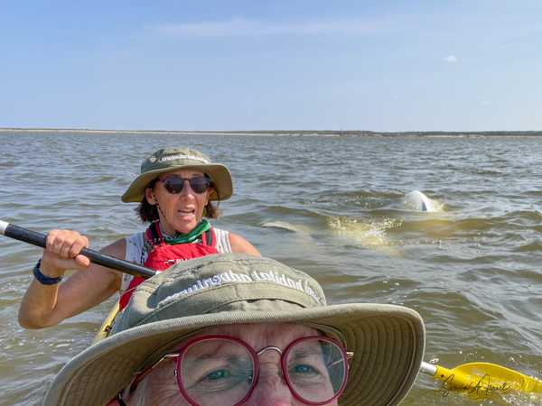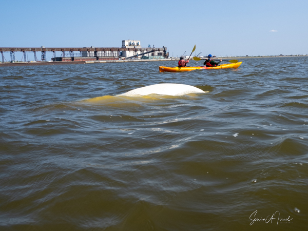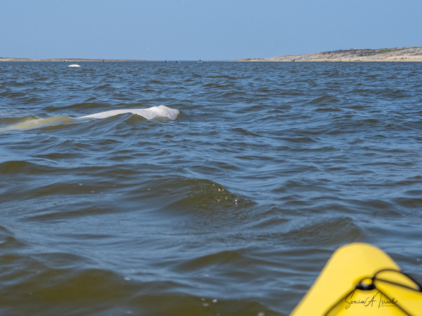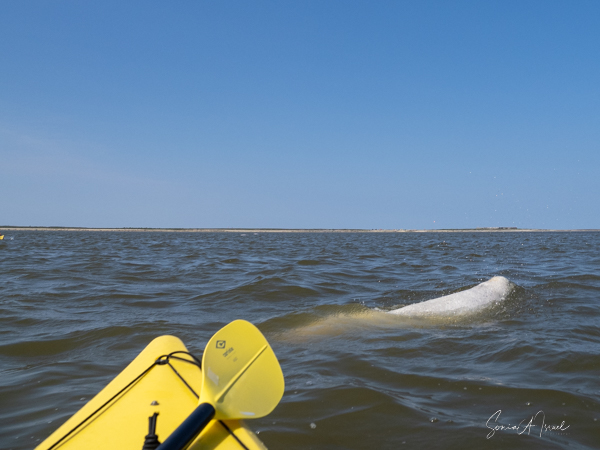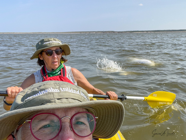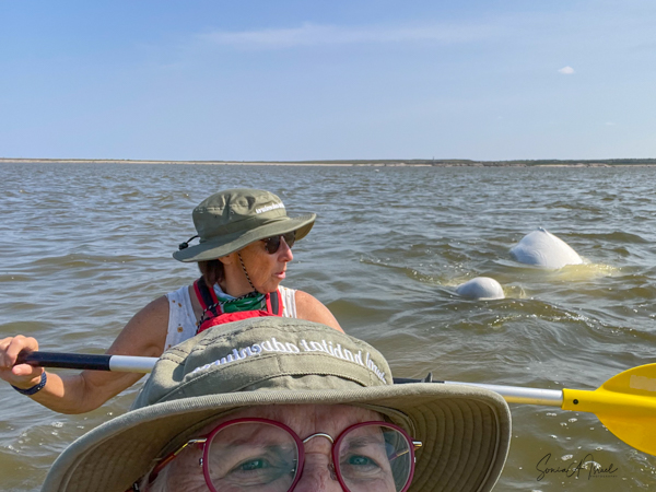 On our last afternoon we got to kayak around the bay for about two hours. After being instructed on how to kayak safely, Ruthi and I climbed into a two-woman kayak, she in the back doing most of the paddling while I was in the front mostly taking pictures. The belugas are attracted to the kayaks and would bump us or follow us. They were everywhere. Again, I didn’t know where to look first. They would be so close and all of a sudden they would be far away. They are fast!