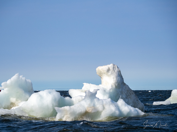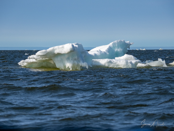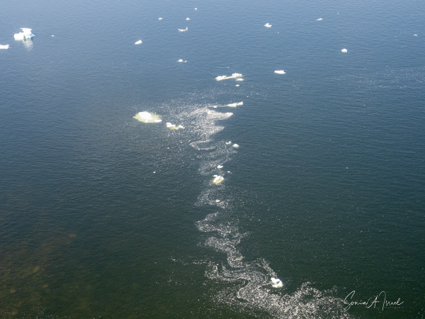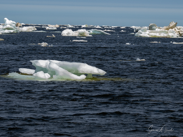 We starting seeing belugas immediately. Grey babies and adolescents. White adults. They were jumping everywhere. I didn’t know where to look first. I had my two OM System M1 Mark III camera bodies, one with a OM 100-400mm lens and one with an 24-100 mm lens. I was ready to shoot. It was spectacular. Finally, finally we were on the water surrounded by beluga whales. And birds. And ice floes.