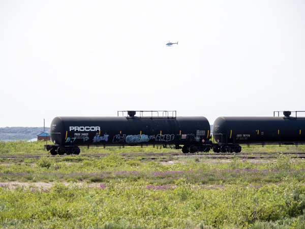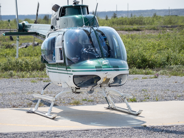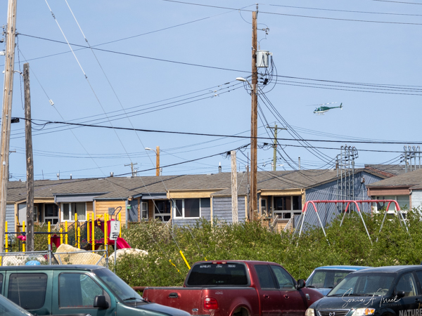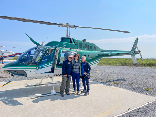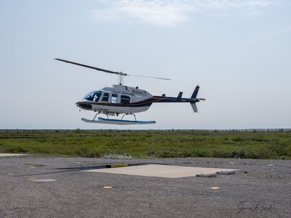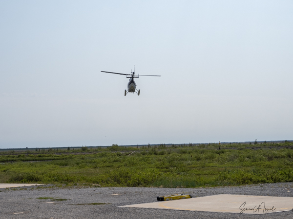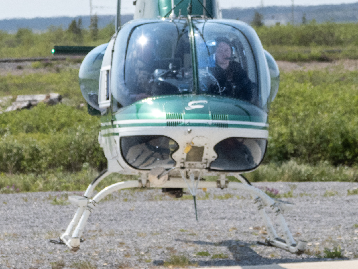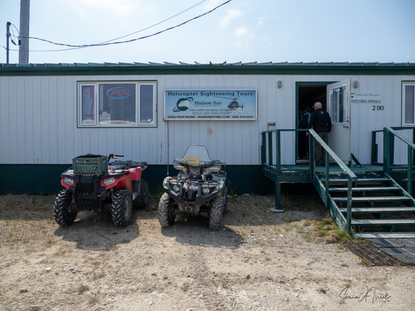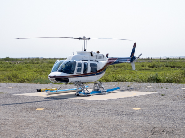 We got to take a helicopter ride over Churchill and Hudson Bay (Hudsonbayhell.com). There were two helicopters and we were separated into groups. We were in the second group, so we got to watch them take off, and then walked around town a bit, doing a bit of souvenir shopping and seeing some of the (few) sights in this small, quaint town. Then we watched the helicopters head back down.