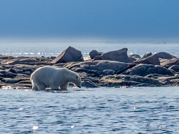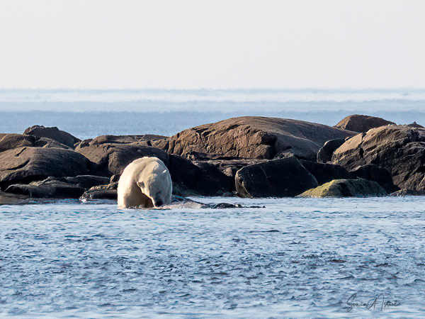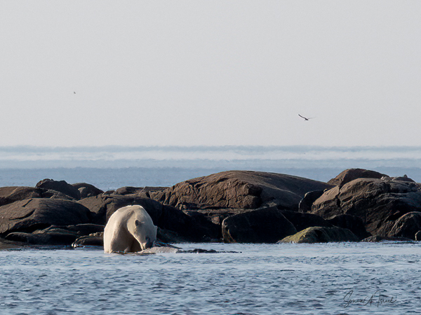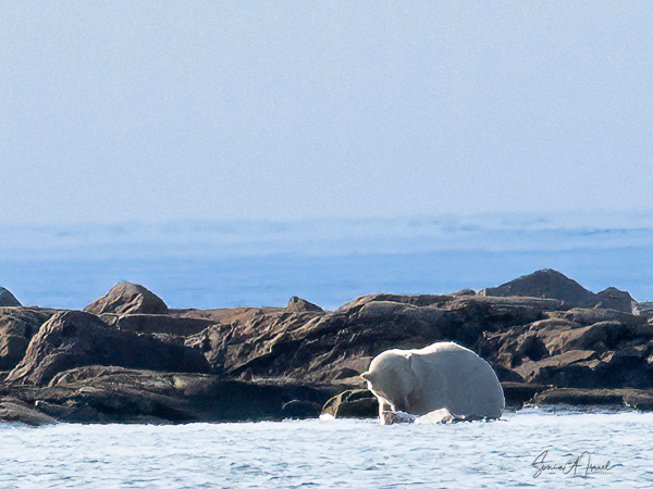 Eleanor looked over with her binoculars and said, “bear.” Sure enough, there was a polar bear standing on the shore, eating a beached beluga whale. He was not hard to miss as he was SO large. I was shocked at how big polar bears actually are. We sat quietly in the boat for over 30 minutes just watching the bear. He went for a swim. He came out and ate some more. He was going about his life, likely feeling very lucky to have found a beluga whale full of blubber to fill his stomach. This would last him all winter.