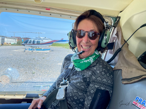 Then it was our turn. Darcy, who has been with Nat Hab from its inception, flew with us. We climbed into the helicopter with our pilot Bob Hamlin, put on seatbelts and headphones, and off we went into the wild blue yonder for our one hour ride. The first group waved us off – and took pictures of us as we had taken pictures of them.