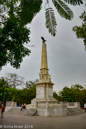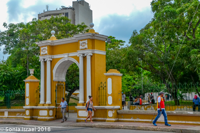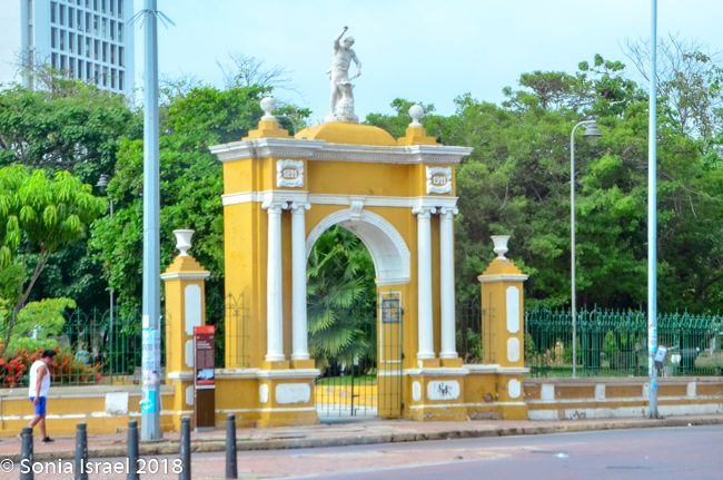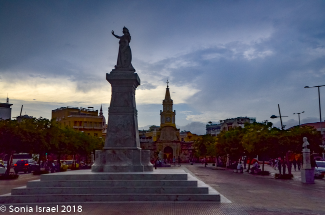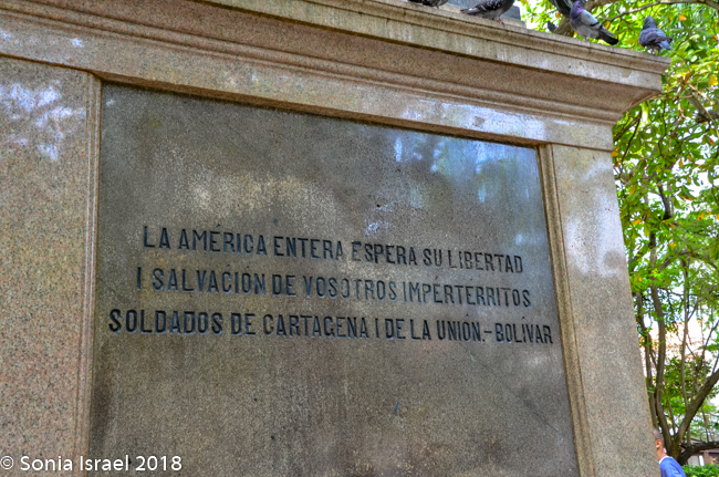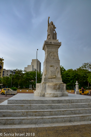 There is also a white marble statue of a beautiful woman (or man? I’m not sure which), in a toga, with a crown on her head and holding a shield in one hand, the Republican coat of arms of Cartagena, the shield of freedom depicting an Indian breaking the chains. Her other arm is raised towards the sky in a show of rejection of oppression. She is standing on a large and elegant pedestal with stairs leading up on four sides. On the base, just under her, are the words, “Noli Me Tangere” (Do not Touch Me). And further down on the base is written, “A Cartagena Heroica, 1811-1911.” While ‘Noli me tangere’ is the Latin version of a phrase spoken by Jesus to Mary Magdalene when she recognized him after his resurrection, here it represents the martyrs and Cartagena telling the world – “Don’t touch me!” and we reject oppression.