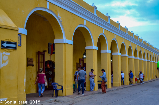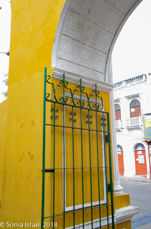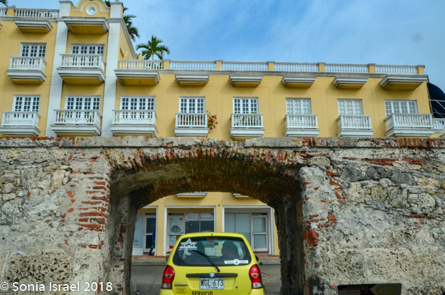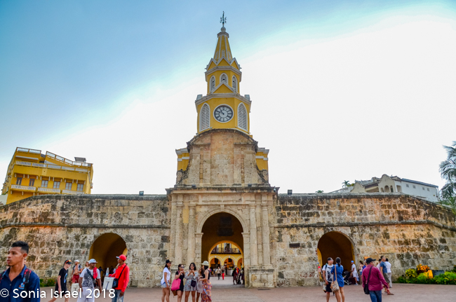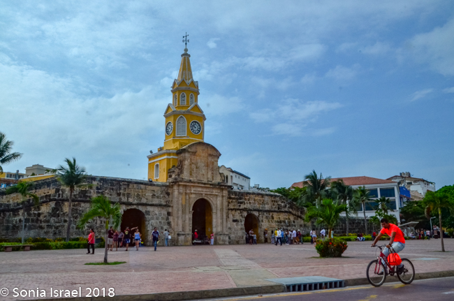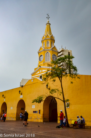 The clock tower itself has a baroque facade and four Tuscan arches with eight sides to show four faces of the clock. The clock was once a US pendulum clock, but it was replaced with an updated Swiss clock. It is painted a bright yellow. Hard to miss and fitting with the rest of colorful Cartagena. And under the Clock Tower is the arched gateway in and out of the walled city.
