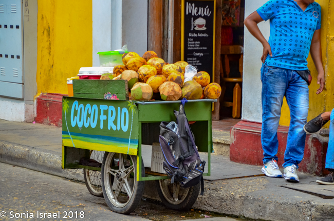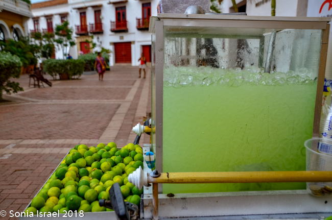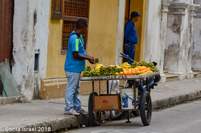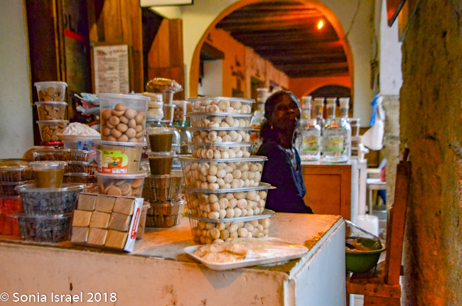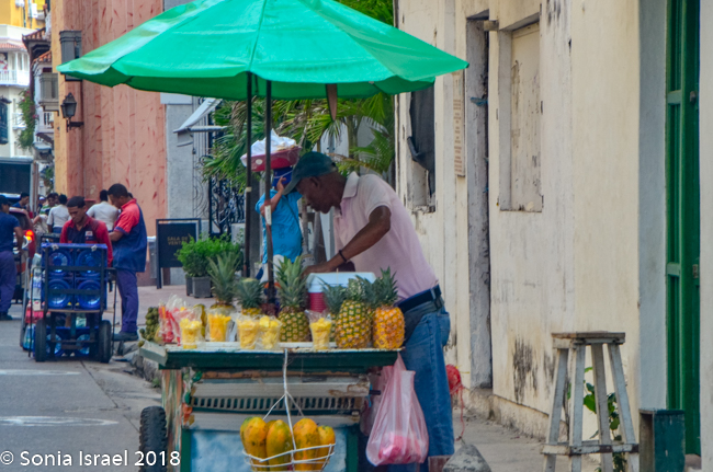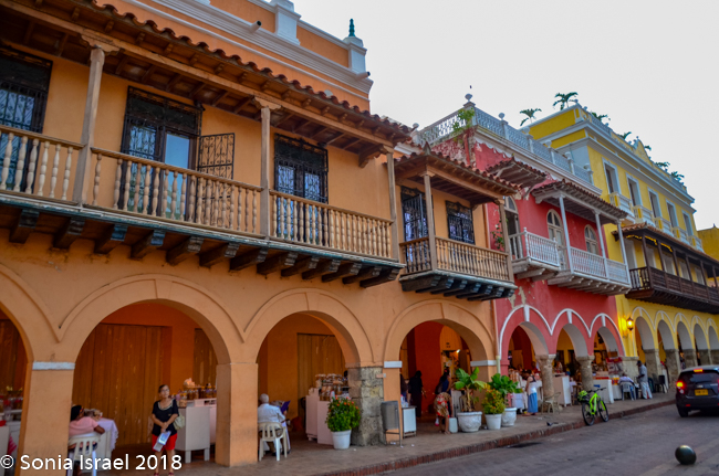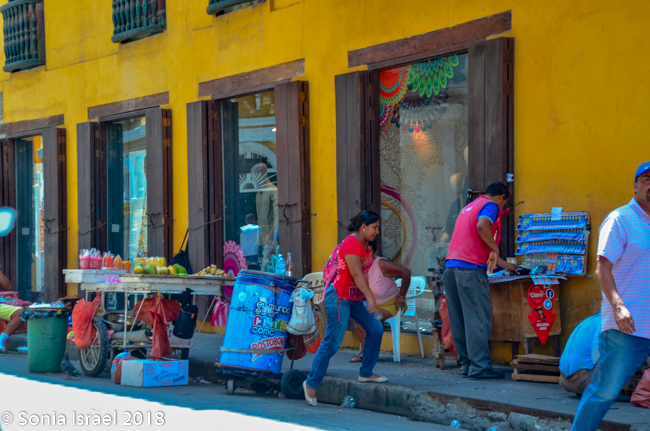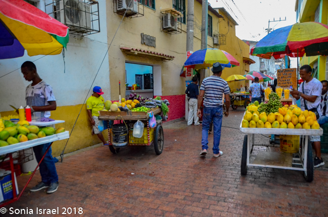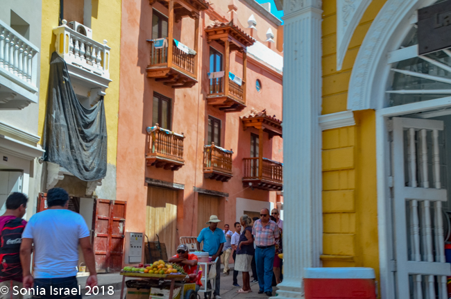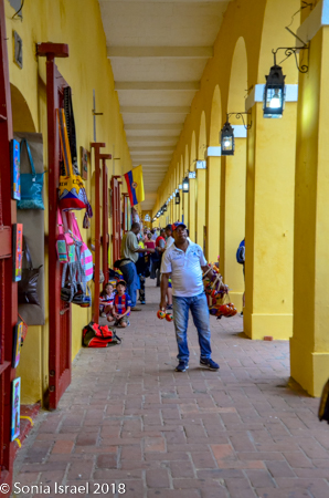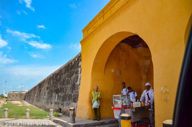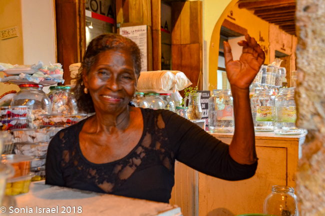 Just across from the Clock Tower is El Portal de los Dulces, the triangular plaza that was once used as a market for slaves. Centuries ago hagglers would come here selling all kinds of pastas and sweets, thus the name. Today it is still has old balconied houses above colonial arches forming an arcade walkway full of confectionery stands selling local sweets. As we walked there, we could smell the pastries and food being cooked and sold. We saw fruit (of course), caramels, coconuts, chocolates, almonds, and things we could not identify. Vicky had us stop at one where she knew the woman selling sweets. So we got to taste some traditional Cartagena candy. The best part of course, was her smiling face.