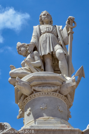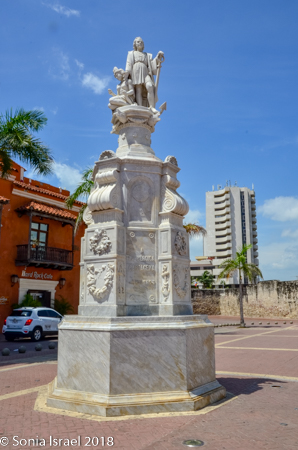 In the center of the square is a large, white marble statue of Christopher Columbus with an indigenous woman kneeling next to him, with her back against his leg. His hand is resting on her shoulder. I’m not sure what the significance of this is, given that Columbus was not particularly good for the indigenous people. (There are some theories that Christopher Columbus was Jewish. Please see the post on the Jews of Cartagena for more details.)