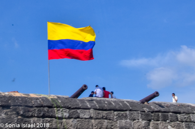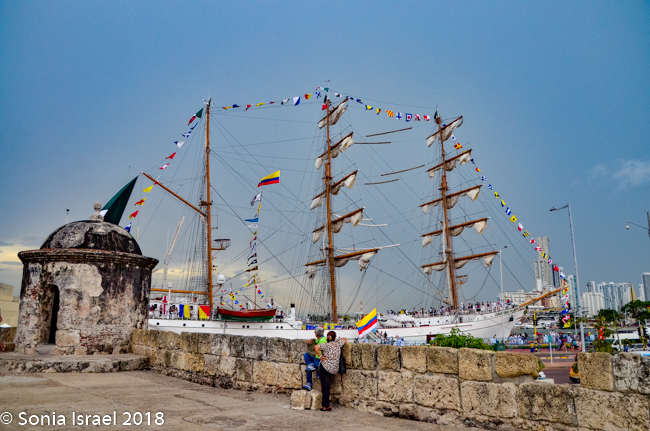 The San Pedro Claver museum was right next to the ramp leading to the top of the old walls, so up we went for the smell of the sea and a view of our surroundings, including the tall buildings of the new Cartagena, the part of town we were told, was not safe to visit. There was a large sailing ship in port with party goers galore. It was part of some festival in town. And there was a huge flag of Colombia flying from its mast.