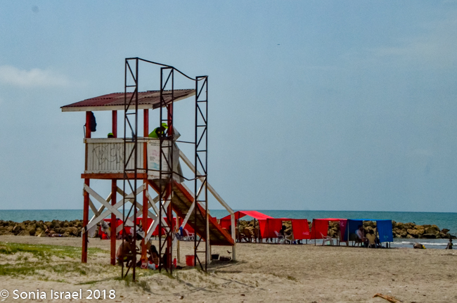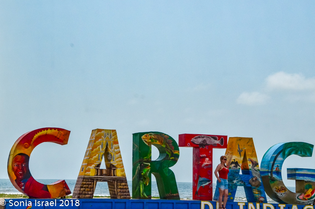 We were met at the airport by Vicky Olivo, our guide for the next three days, and Jose, our driver. We walked out of the air-conditioned airport building back into the heat. We immediately felt like we were in the Caribbean. We drove along the sea and were welcomed by a large, colorful sign, CARTEGENA, with a woman in a red bathing suit and short shorts standing in front of it, under the turquoise sky, posing for a picture. There were colorful cabanas all along the shore. And that should have been a clue that the best word to describe Colombia is colorful.