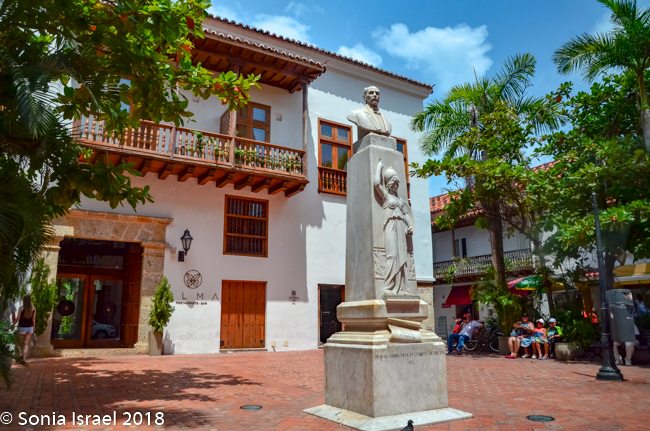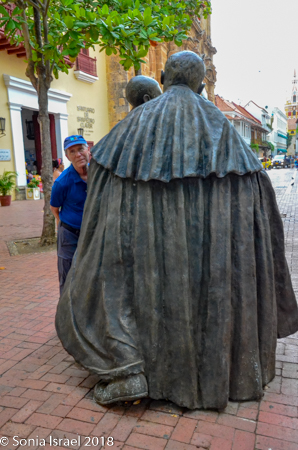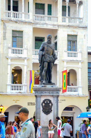 In the center stands a statue of Pedro de Heredia, a Spanish conquistador who was the founder of Cartagena. The statue itself is high on a pedestal which makes it look like he is glaring down at those of us below. His large sword and breastplate make him look menacing and his huge beard and furious expression don’t help. But he has an interesting story. He was born in Madrid to wealthy parents. There was an assassination attempt made on him in an alley. There were six men and that fight left him with a badly disfigured nose. He later tracked them down and killed three of them which led to him fleeing to the New World to escape punishment. As a conquistador, he conquered all of Colombia and half of Ecuador.