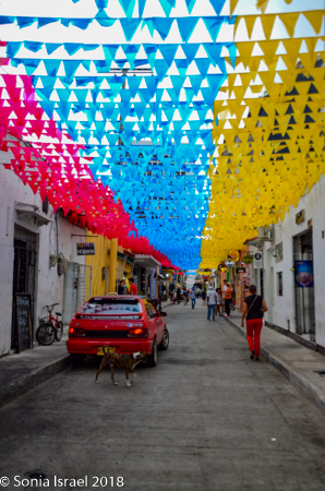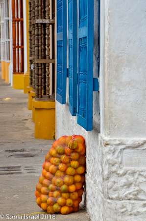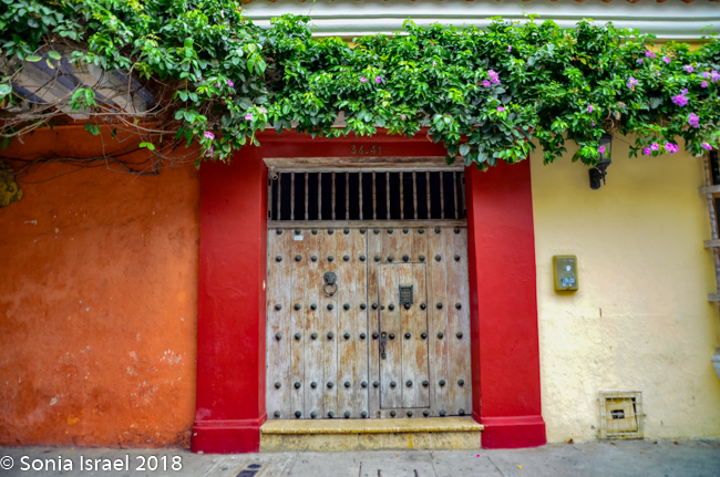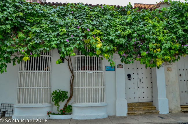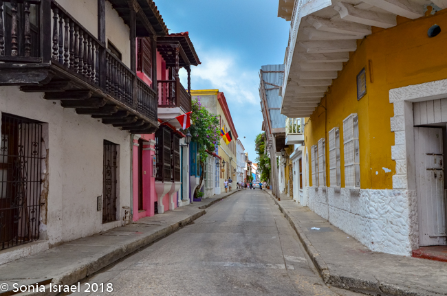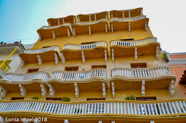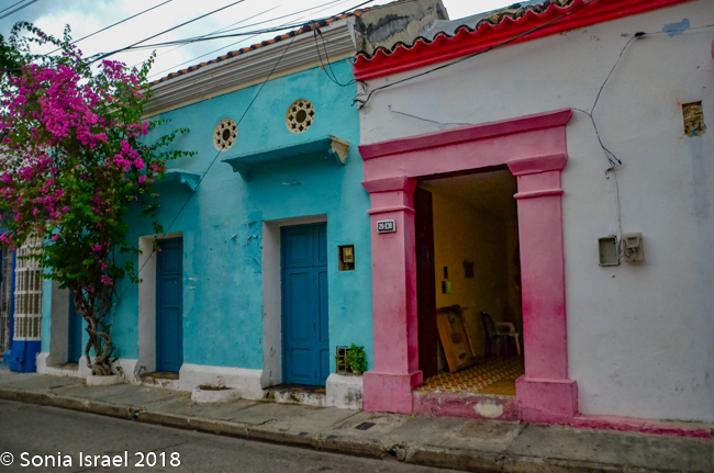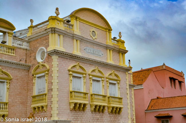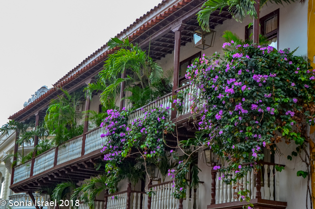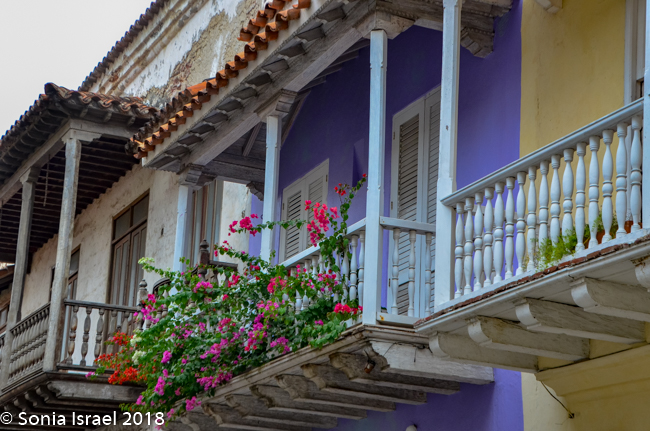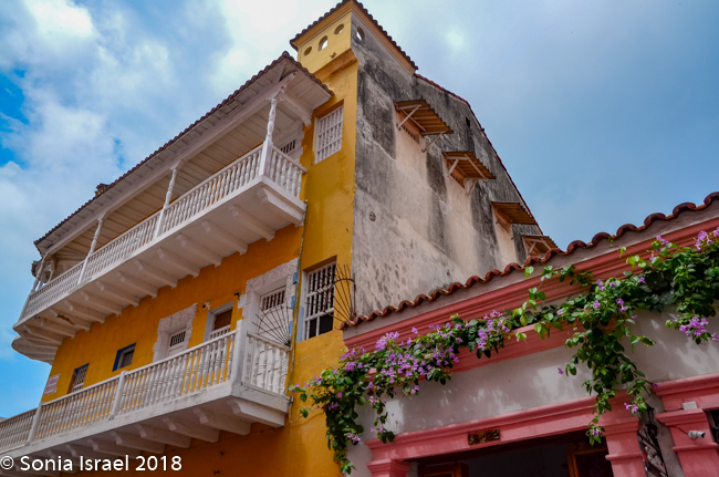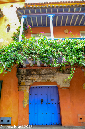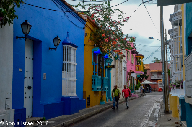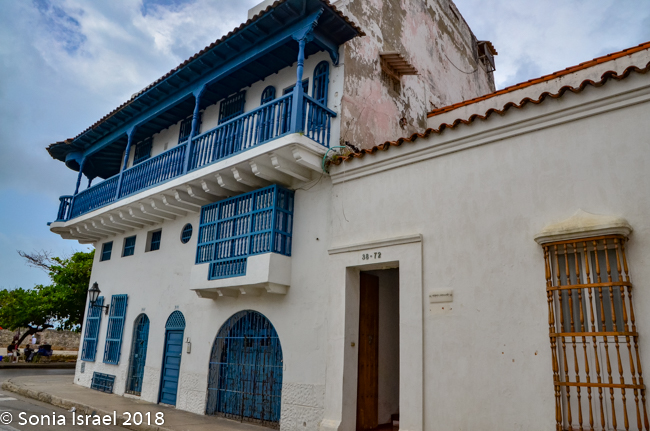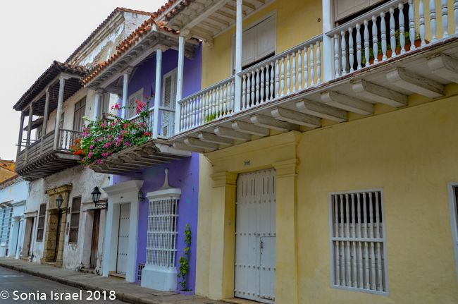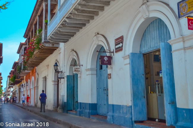 We walked through narrow, curvy, irregularly shaped cobblestone streets lined with colorful colonial houses standing 3 or 4 stories with balconies and flowers. Blue doors on white houses. Purple with yellow. Orange. Red. And often more than one color on each house. Color, color, color. This is the historic center of the city, the walled enclosure.