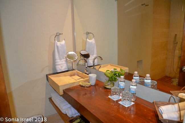The hotel was beautiful with not only wooden doors, but lots of wood inside. There was an entry way with a side room filled with a large wooden desk where we checked in. We were immediately served two glasses of cold corozo juice, a