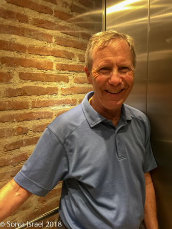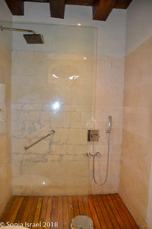 We took the small elevator up to our floor. The elevator was all glass which allowed us to see the old red brick walls which now made up the elevator shaft. Once off the elevator, there was a walkway along the balcony overlooking the courtyard. But our room was around the corner, overlooking the swimming pool.
