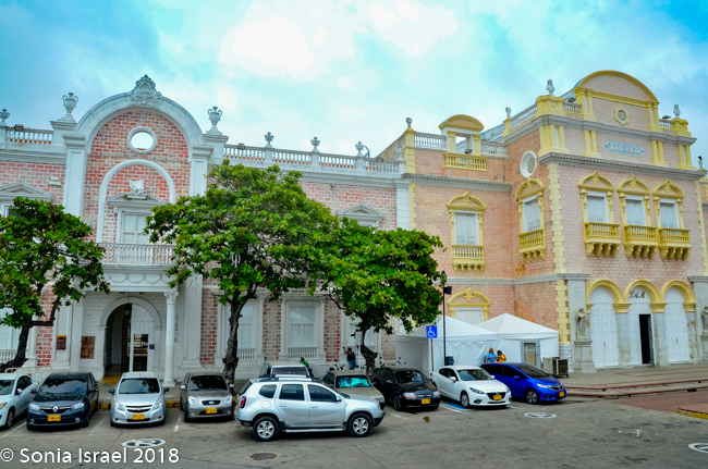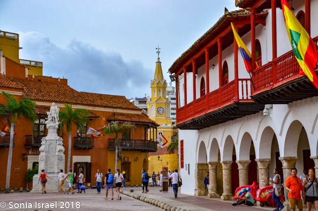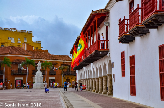 A few blocks away from Plaza San Pedro Claver was another, very large plaza, the Plaza de la Aduana, also known as the Custom’s Square. It is one of the largest plazas here, with vast open space. On one side are the imposing city walls. On another side is the old colonial customs house where goods entering the city from the port are processed and customs paid. Now it is the City Hall and the mayor’s office. There were three bright flags with a red outer border, a yellow inner border and a green square with a white star, the flag of Cartagena. And through the break between the buildings, we could see the Cathedral.