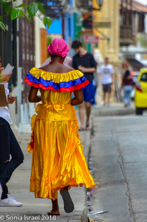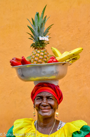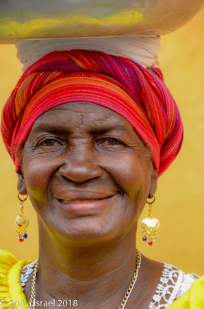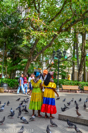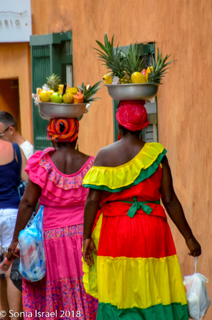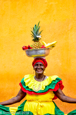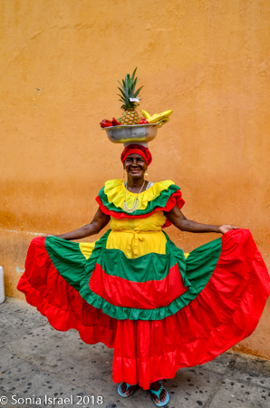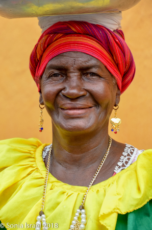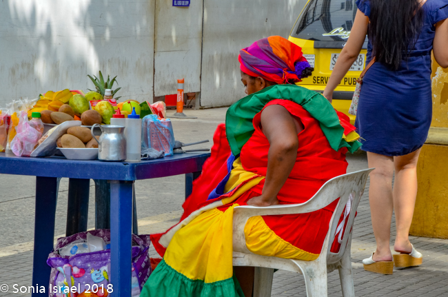 But then there were the Palenqueras, black women dressed in traditional colorful dresses, balancing bowls of tropical fruit on their heads. They used to sell fruit, and some still do, but mostly today they make their money posing for pictures. If you wanted a picture of them, you had to pay. I was able to get many pictures of them from farther away, and I rarely pay for pictures. But this was one of those times when it was very worth it. I picked an older woman, one with an interesting face full of time and age and stories. She gave me a wide smile. My favorite part of shooting pictures of people is when they smile at me. Who are these women? Where did they come from? And how exactly have they become the symbol of not just Cartagena, but of Colombia? That is the story of Palenque. This woman was from Palenque, a small town we would be visiting the next day and it is the story of Palenque that explains the story of these women (please see that post).