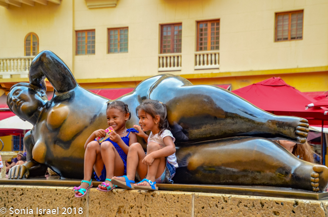Cartagena is also filled plazas. Places to sit and drink coffee and watch the world go by. One of the plazas had a large Botero statue, our first for this trip. I learned about Botero many years ago and always loved his sculptures. Botero was from Colombia and is therefore one of Colombia’s favorite sons. His statues are everywhere and we would get to see lots of them over the next ten days. Botero was from Medellin, and that is where I will write more about him (please see that post). For now, suffice it to say that his statues are like his name – round. The one in the square was one of his Mujer Reclinada (reclining woman), La Gorda Gertrudis, but the best part was the two young girls lounging against the “mama”, posing for a picture. Not posing for me, but I took the picture anyway. And of course, for a few pennies (actually for many dollars) you could buy a replica.