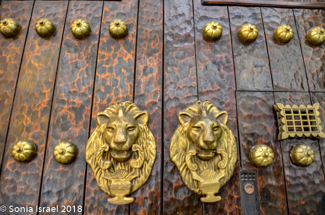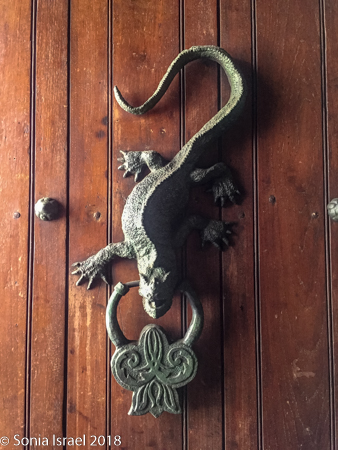 Each door had an elaborate knocker on it, called aldabas. This started out as a Spanish colonial tradition. The Spaniards were fond of saying, “A tal casa tal aldaba,” (“To each house its door knocker.”) Today these are ornamental but once they symbolized the family’s social status and wealth. And whatever the knocker was, represented the person’s profession or occupation. A fish on the door? A fisherman lived there. A lion? A member of the army or a protector of the city. A mermaid? A merchant. A lizard? Royalty. Hands? A clergy member.