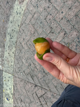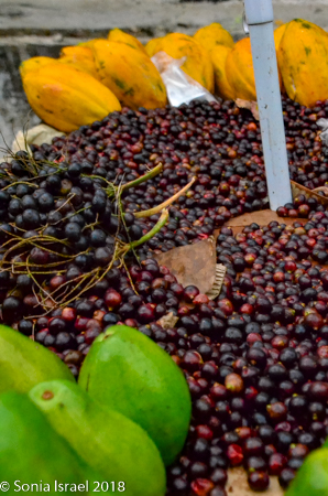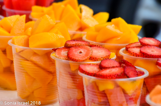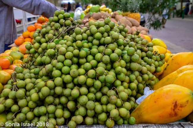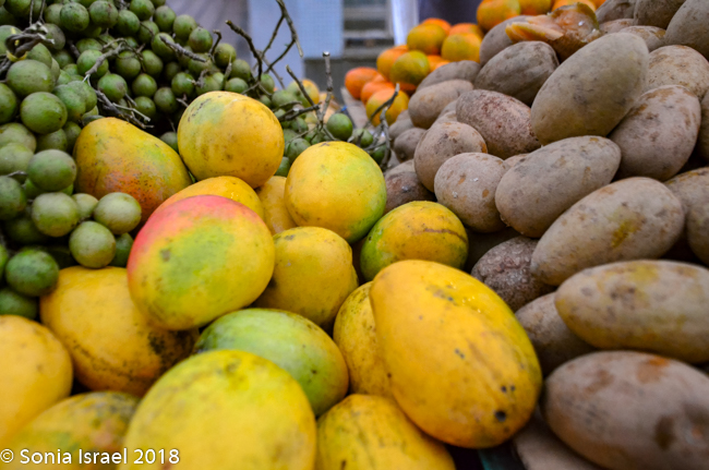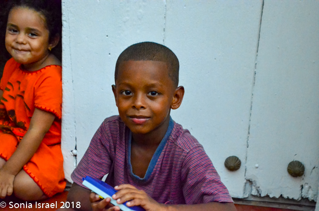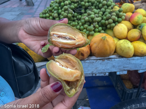 We continued walking through the narrow streets, admiring the colors of the houses and more street art. There were children everywhere, some shy, some ready to smile and pose for pictures. Vicky wanted to be sure we tasted all the local fruit, fruit she grew up eating but fruit we never heard of. We stopped at a cart overflowing with different fruit. First we sampled a mamon, also known as mamoncillo or Spanish lime (or limoncello or chenet or many other names). It is a small green bruit, a bit larger than an olive. The skin of the mamon is very thin, but hard. Vicky broke it open and we scooped out the inside with our teeth and tongue. It was orange/yellowish, creamy and sweet and tangy. The second one we tasted was a zapote, a roundish brown fruit which was brown and rough on the outside, The inside was a dark orange, creamy with two large seeds. The flavor was one I would describe as strong. Likely an acquired taste.