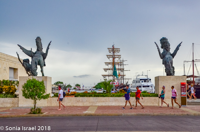 First, they stand as sentinels at the entrance to the harbor of the Bay of Cartagena, near the convention center, where they can also welcome visitors.