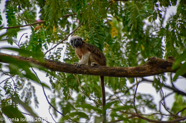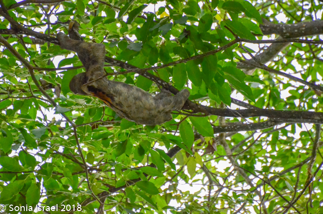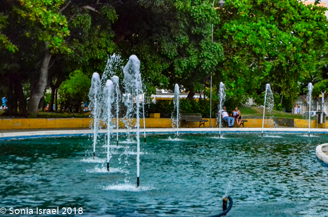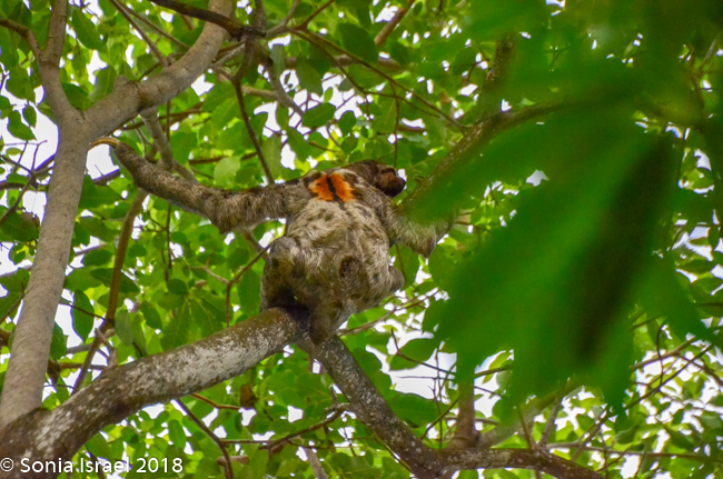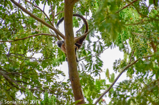 There was a large pool and fountain with little children playing with the water. There were large trees and when we looked up, there was a sloth! Yes, a sloth, as clear as day. He was slowly, slowly, slowly climbing around the tree, as sloths are apt to do. And on the other tree were monkeys, one with a baby on its back. Little did I expect to see either a monkey or a sloth. It was fantastic. We stood there quite a while watching each of them.