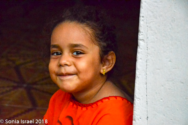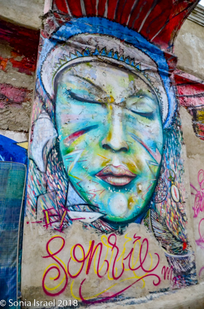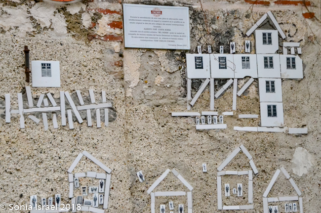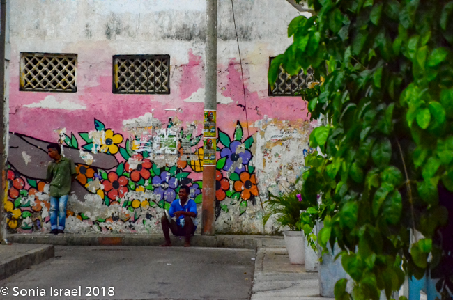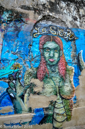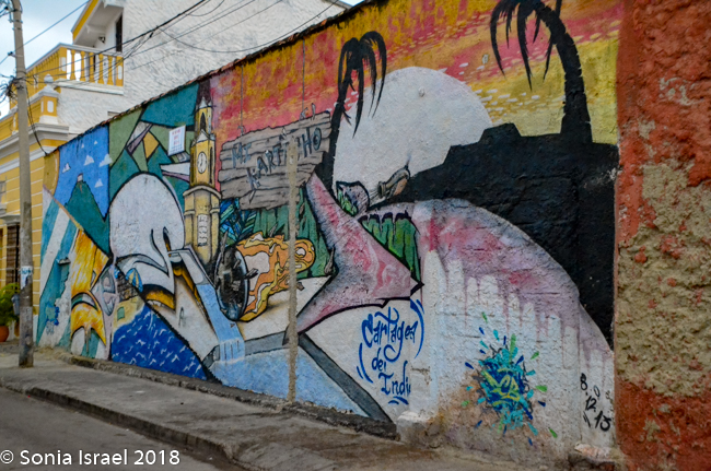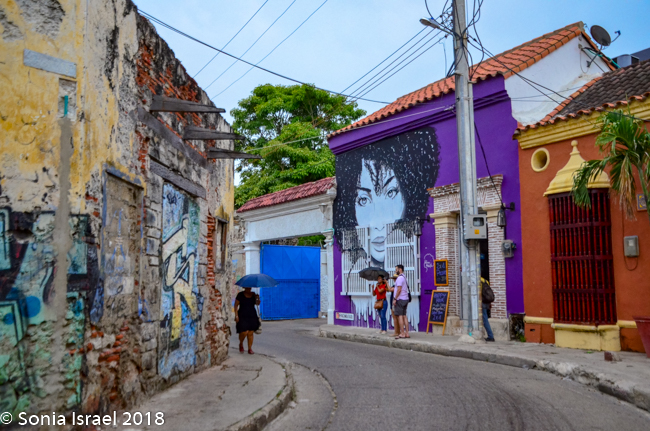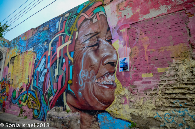 This area used to be where the lower class and servants of Cartagena lived. There was still garbage all about and you could see the poverty. But there was also beauty. Lots of beauty. The area is being gentrified and is considered the artistic heart and soul of Cartagena. The streets were narrow and curvy. But the crumbling stucco walls of the authentic Spanish Colonial buildings are covered with vibrant depictions of the Caribbean life. The paintings included tropical scenes, lots of faces, visual depictions of folk tales, traditional Colombian palenqueras (the fruit sellers I wrote about above), and vignettes depicting the rise of the Afro/Caribbean Colombians who inherited Cartagena from the Spanish hundreds of years ago. Of course, my favorites were the faces. We kept walking admiring the colorful houses and street art. And the children sitting on the stoops.