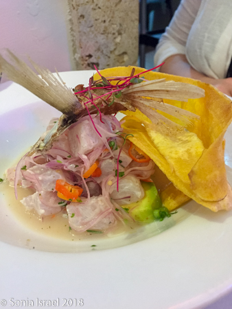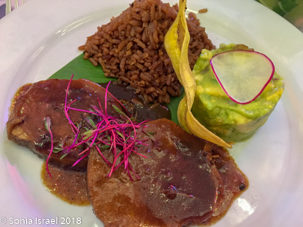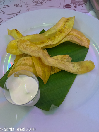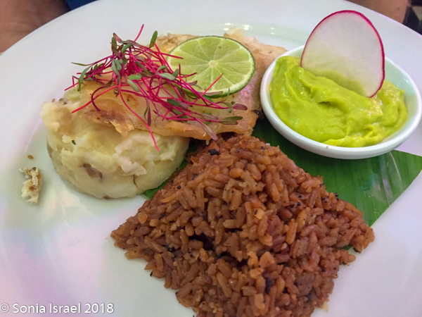 We were served complementary plantain chips with some wonderful dipping sauce. As instructed, we ordered the traditional beef medallions with rice with coconut milk and guacamole, and fish of the day, which was seabass, also served with rice and guacamole. While we waited for our food, I had a Mojito which was wonderful. The entire meal, including a bottle of water, was $34. And delicious!