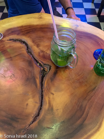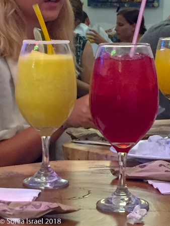 markets, lightly lit so it looked like everything glowed. We got to the restaurant at seven and they were already only a few empty tables available. There were several rooms and it looked like this was once a home now converted to a restaurant. The walls were thick and white and covered in all sorts of art and the floor was large black and white tile. The tables, all close together, were carved of beautiful wood. We quickly made friends with the people at the tables next to us. The couple on our left were from San Diego. Small world! The group on our right were six women on holiday, all ordering large, beautifully colored drinks. I have no idea what they were.