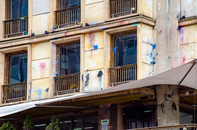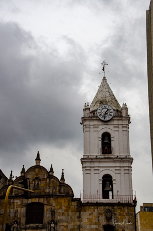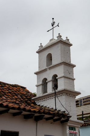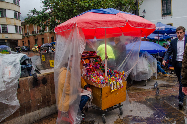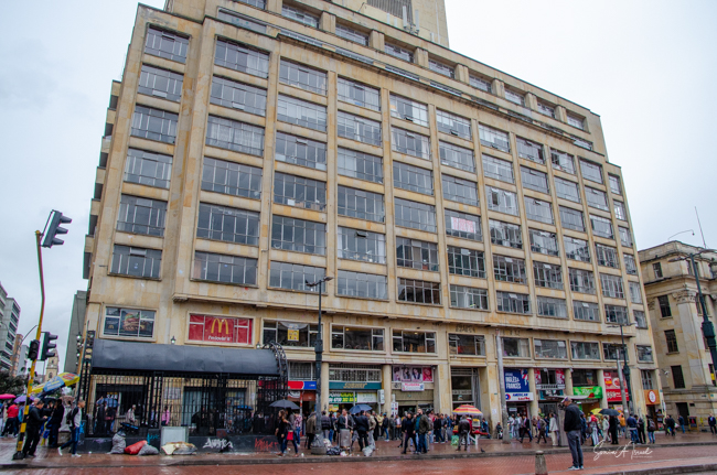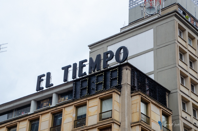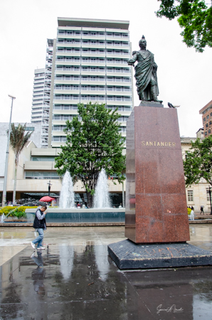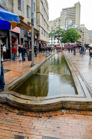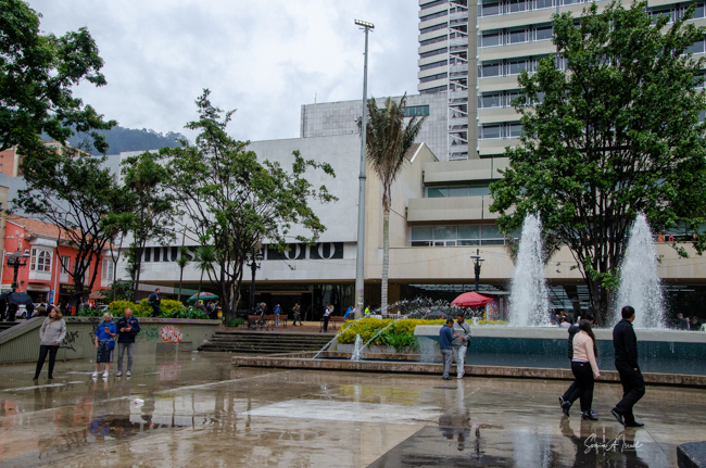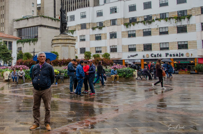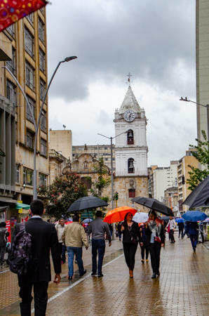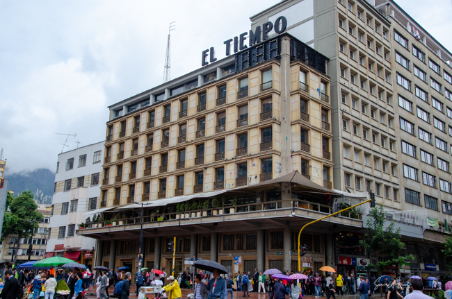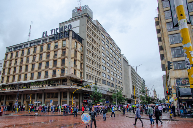 Juan parked his car and we started walking along Avendia Jimenez, now a pedestrian mall. This was once the boundary of the city and over time, saw its share of riots and violence, but today it is a beautiful walking street, even in the rain, surrounded by colonial churches, the Gold Museum, and the El Tiempo building (the Bogata newspaper) which is still filled with bullet holes from violent days gone past.