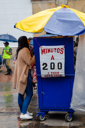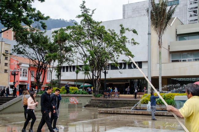 I mentioned that the city of Bogota started in La Candelaria. Some people say it started on Plaza de Bolivar (see below), but other believe it started right on The Chorro de Quevedo Plaza in 1538. The road to the plaza is called Calle del Embudo – the Funnel street because it is shaped like – yes you guessed it – a funnel. This plaza was full of people and yes, like the rest of La Candelaria, full of color. And I read that on Friday afternoons there are storyteller sessions with people packing the plaza to hear them.