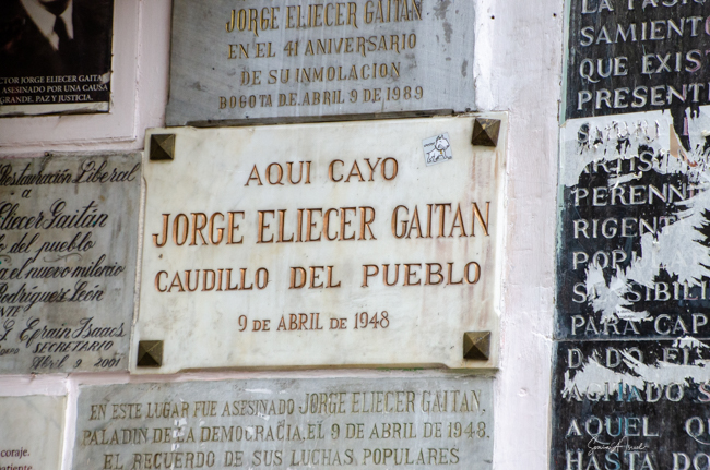 Our next stop was at the Jorge Eliecer Gaitan monument. Gaitan was a left-wing Colombian politician and leader of the Liberal Party. He was mayor of Bogota as well as the Education Minister and Labor Minister. But it was while he was running for President, and likely to win, that he was shot in the head three times, in broad daylight, on the spot where we stood. His assassination changed the history of Colombia forever. Ironically, Gaitan was opposed to violence, yet his assassination set off the Bogofazo (the sack of Bogota), a violent riot between the conservative that ended up being a 10-year violent period (La Violencia) of political unrest during which 300,000 people died.