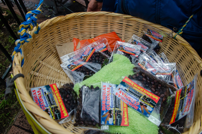 After lunch we meandered back on Avenida Jimenez. At one end of the avenue is the Santander Park, once called Parque de San Francisco because it was next to the San Francisco convent and church. In the middle of the park, along with a a beautiful fountain is a statue of Franciso de Paula Santander, a Colombian military and politician famous for helping in the fight for independence alongside Simon Bolivar. The park was full of people, as the rain had stopped, and vendors were everywhere. One was selling “Big Ass Ants.” I had no intention of buying or eating ants, but the vendor did give me a big smile for a picture.