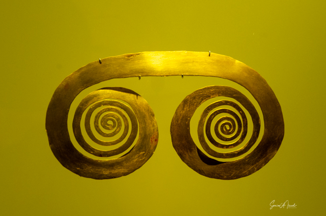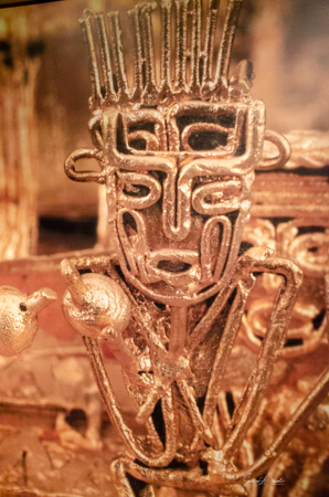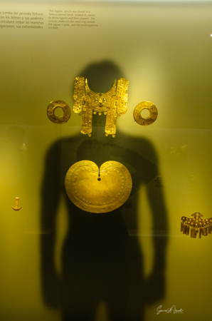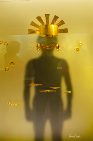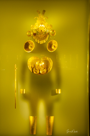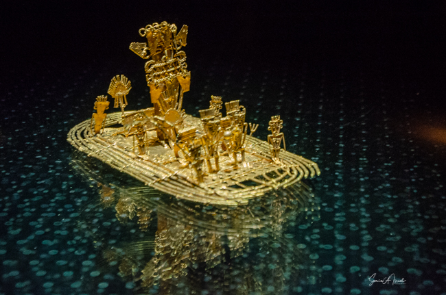 Or as it was written in the museum: “By that lake of Guatavita they made a great raft of reeds, decorating it as beautifully as they could…They undressed the heir, anointed him with a sticky earth and dusted him with ground and powdered gold, so that he went in the raft completely covered with this metal. The golden Indian made his offering, casting all the gold and emeralds he had brought into the middle of the lake, and the four chieftains who were with him made their own offerings; and when the raft landed the feast commenced, flutes and conch shell trumpets, with great dances in circles according to their custom, with which ceremony they received the new ruler and acclaimed him their lord and prince. From this ceremony came the celebrated name of El Dorado.” (Juan Rodriguez Freyle, 1636)