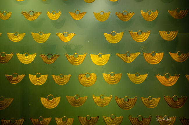 Gold in Colombian culture, as in many cultures, was of extreme importance. In Colombia, having gold meant that you were close to the sun, so you had to be listened to. The collection here at the Museum of Gold is the largest one of gold artifacts in the world, along with collections of pottery, stone, shell, wood and textile objects, all representing the different indigenous cultures living in Colombia before the Spanish conquest of the Americas.I walked around the different floors of the museum in awe. Not only were the Pre-Colombian gold pieces on display magnificent, the displays themselves were astonishing. For example, you could stand in front of an exhibit and see yourself wearing the gold crowns and collars.