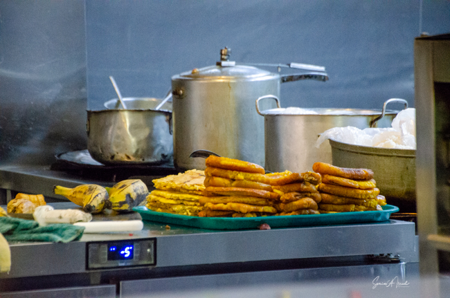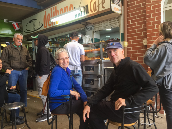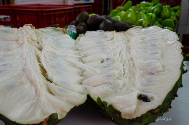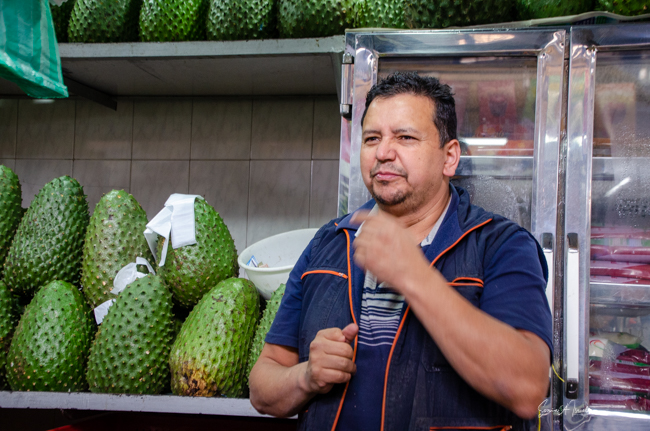 And for me, this is the epitome of why I travel. The large, large hall was full of colors, smells and as we would find out, tastes. But the best part was watching the people, both those buying and those selling. Juan knew many of the vendors and knew exactly where he wanted to take us and what fruit he wanted us to taste. At each stall, he would chat with the vendor, catching up and choosing the specific piece of fruit we should taste – or letting the “professional,” the vendor, choose for us. We tasted a tomato whose flvor burst in our mouths. We tasted lulos (“little oranges,” which we call Naranjilla, and which were very sour), sour sop (a greenish-yellow color, prickly skin, and creamy, white flesh tasting like a combination of strawberry and apple, but with a little citrus mixed in), avocado, granadillas (small egg or football shaped orange fruit full of little black seeds which we ate with a spoon. It is related to passion fruit, with a sweet and sour taste), and nispero (loquats which I have growing in my backyard).