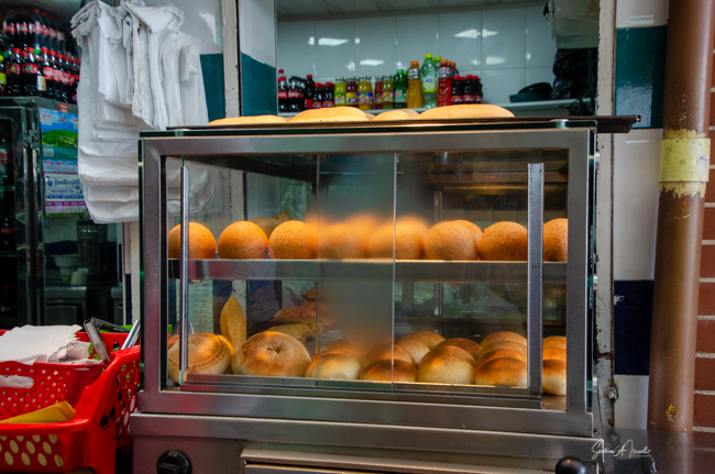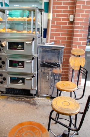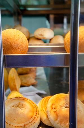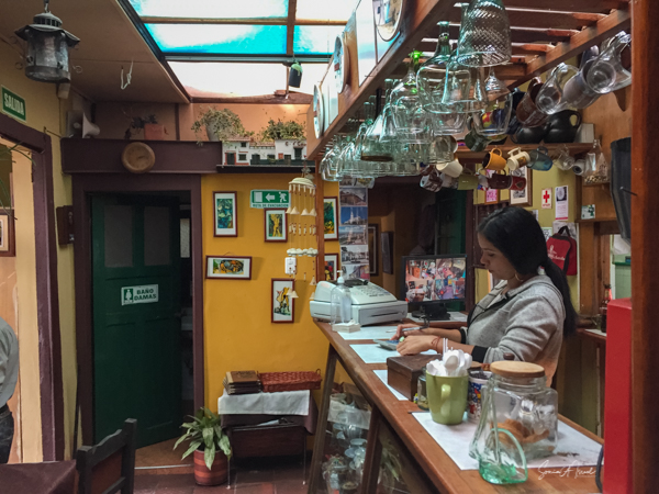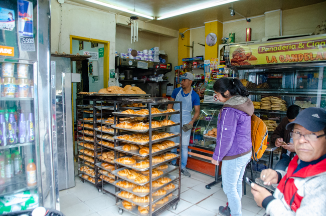 And we ended up back in the front, where there was a shrine and a large oven baking breads, and little chairs for people to sit and eat and drink coffee. We tasted bunuelos (a dessert made from fried dough covered in cinnamon sugar), almojabana (a type of cheese bread with guava inside), and Pan de bono (made of cassava starch, cheese, eggs, and yucca). Along with our Colombian coffee, it was quite a morning treat.