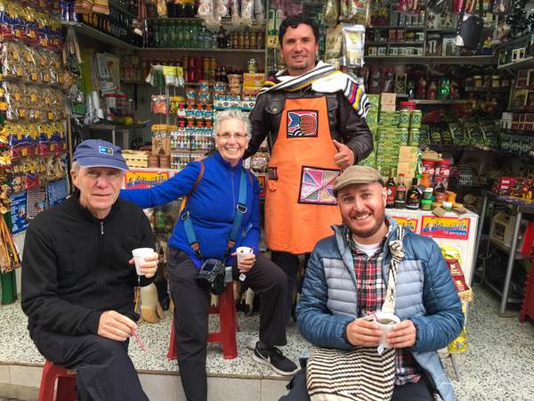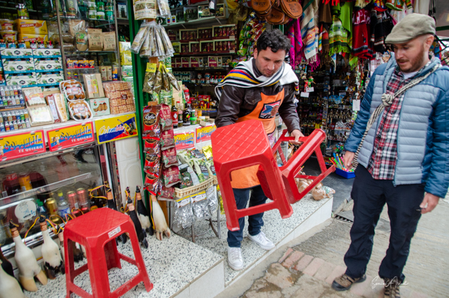 After walking around the church, we wandered back to buy some gifts at the many souvenir shops along the cobbled stone streets. It was just like being in a shuk or old market place with shop after shop after shop. But here too, Juan knew just where to stop. He spoke to one of the shop keepers, who then brought out three red stools and served us hot chocolate. And we played games with one of the shopkeepers.