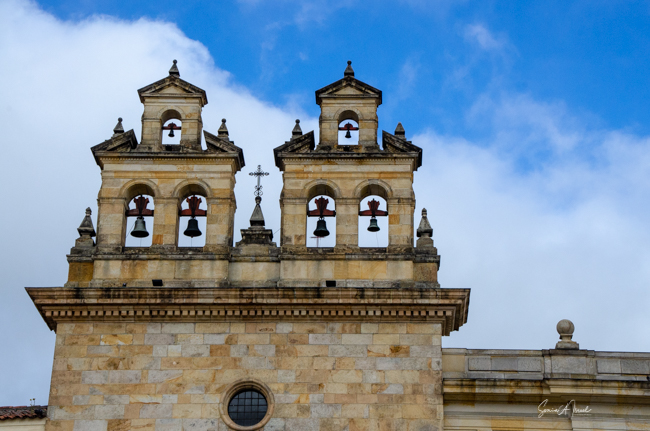 Cathedral Basilica Metropolitan & Primate of the Immaculate Conception & Saint Peter, a Roman Catholic cathedral on the eastern side of the square, is the largest cathedral in Colombia and is the seat of the Archbishop of Bogotá. The remains of the founder of Bogota, Gonzalo Jimenez de Quesada, rest here. It is an imposing building with two large bell towers and the Andes and Monserrate peeking behind it.