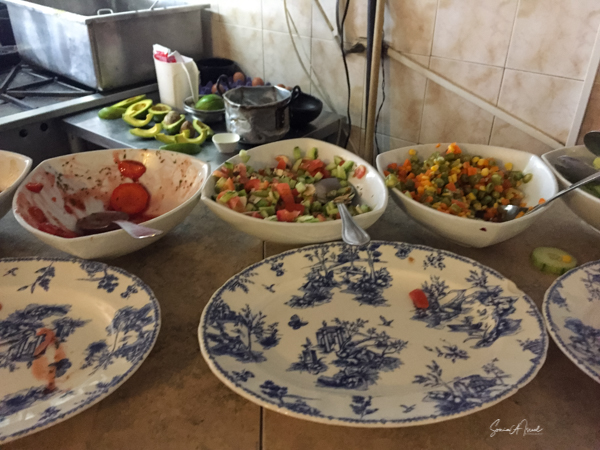 Calle Luna was right at the Plazeleta Del Rosario and down a few doors from the Emerald Trade Center. We walked in and the place was already quite crowded. The tables were all made of wood with wooden chairs. We managed to grab a table and settled in. Except we had to get right back up again. Lunch includes a salad bar, a main course, a drink and dessert all for a reasonable price (I have no memory what we paid, but the website says it is about $5.00). So we got up to explore the salad bar. This was not like any salad bar you see in the States. It was full of the most beautiful blue and white serving dishes filled with exotic salads in all colors. The cook stood behind it, stirring pots on the stove. The restaurant is known for its paisa (a typical Colombian meal which is a huge mixture of food on more of a platter than a plate, consisting of grilled steak, fried pork rind, sausages, on a bed of rice and red beans that is then topped with a fried egg and a side of sliced avocado and sweet banana chips. Just as this meal sounds, paisa means “countrymen.”) and for ajiaco (a hearty chicken soup made with potatoes and corn on the cob). But we had other plans for ajiaco and the paisa had too much food as well as things we don’t eat. So instead, we enjoyed the multiple salads, a simple main dish and rice pudding for dessert. It was a simple yet delicious meal.