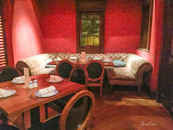 We had a little difficulty finding it as it is in a house set back a bit from the street. And not just any house. It is a huge, sprawling, house, covered in ivy. We walked up the front steps and opened the large door which led into the entry. The restaurant was huge, with a downstairs, upstairs and garden seating. There were chandeliers lighting the rooms, fireplaces, couches. It had a warm and inviting atmosphere.