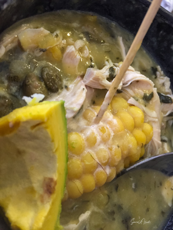 The menu also explains about the history of the Ajiaco. “This recipe of prehistoric origin has its beginnings among the indigenous communities called “Chichba” whom inhabited the hgh valleys of the eastern cordillera, nearby to what is known today as the cities of Bogota and Tunja. “Ajiaco is one of the most elaborated soups which contains three potatoes…and corn which was one of the most important food sources for the Native American communities. The characteristic flavor of the ajiaco comes from the pre-Colombian herb well known as “guascas” (quickweed) which grew in a wild way in the high valleys where Chibcha communities lived. Later, with the arrival of the Spanish, chicken, capers and cream were integrated into the soup.”