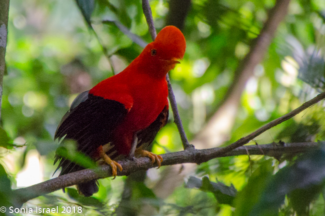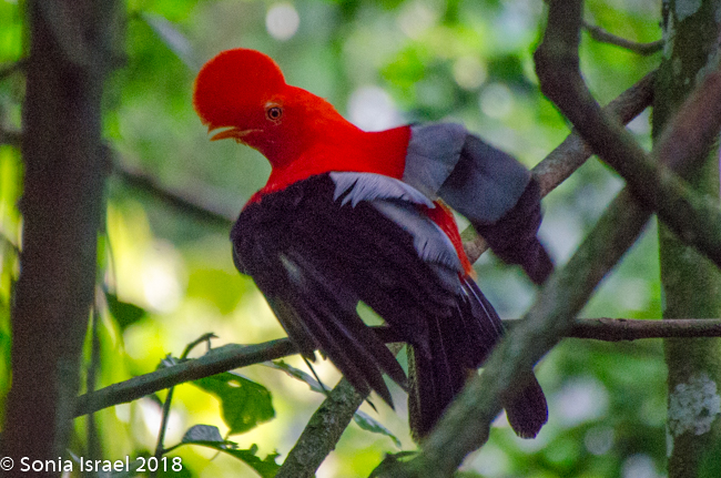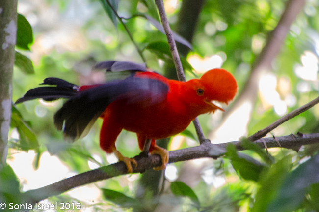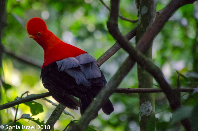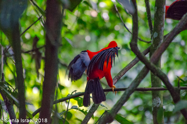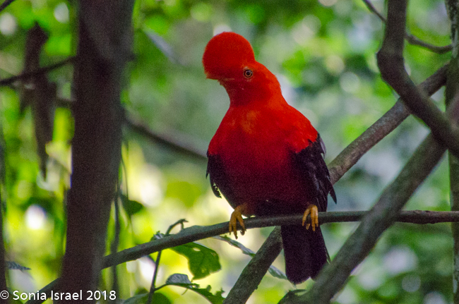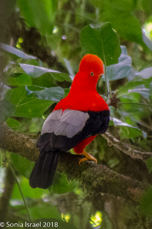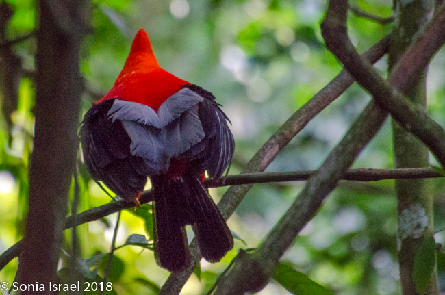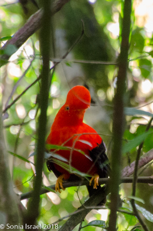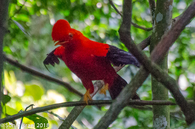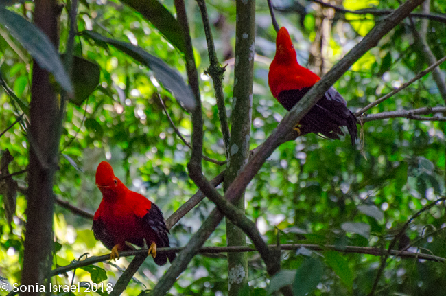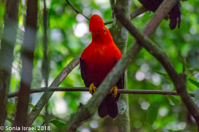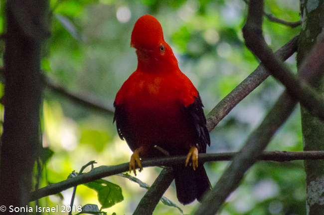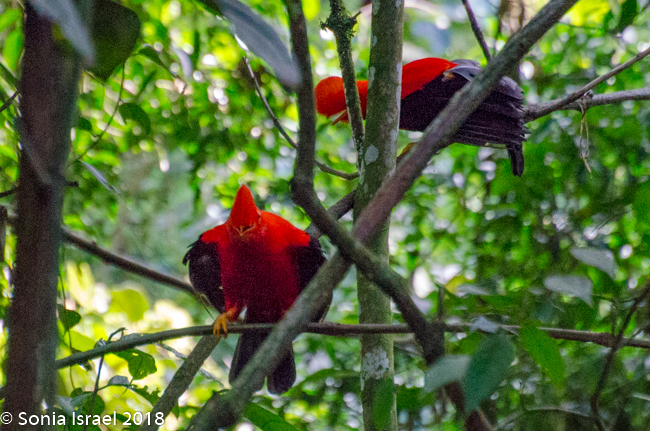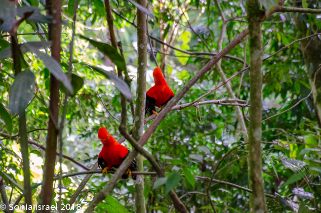 And there they were. They were magnificent and like nothing I had ever seen before. The upper half of their body was an orange-red, the wings black and there was a gray patch on their backs. But it is their heads that were so fascinating. They look like a rooster (and that is their nicknames), with a big, disc-like crest on top of their heads. And a yellow beak. And they were big. They were jumping up and down on the branches, displaying for the females (who we did not see). And they were making low, guttural croaks sounding like “tank, tank, tank.”