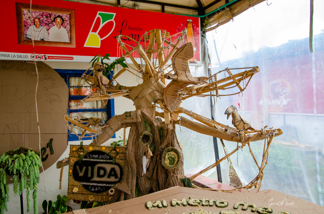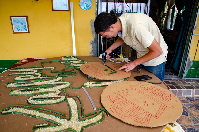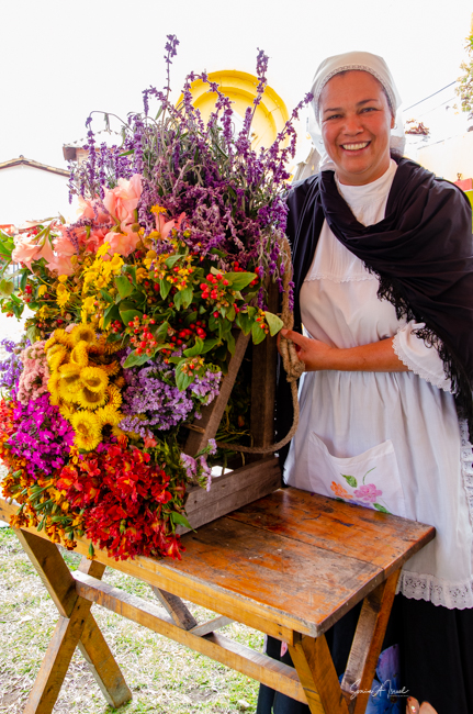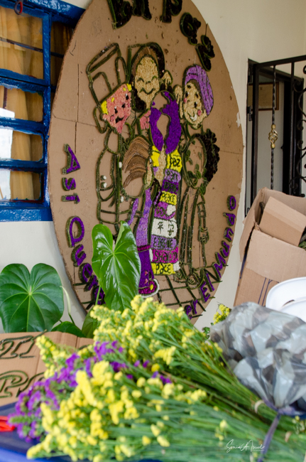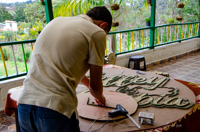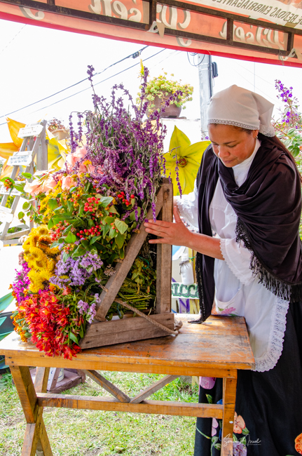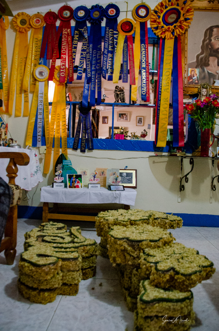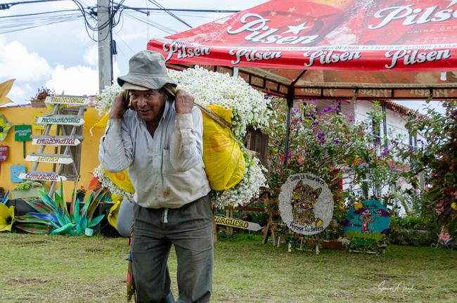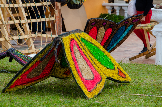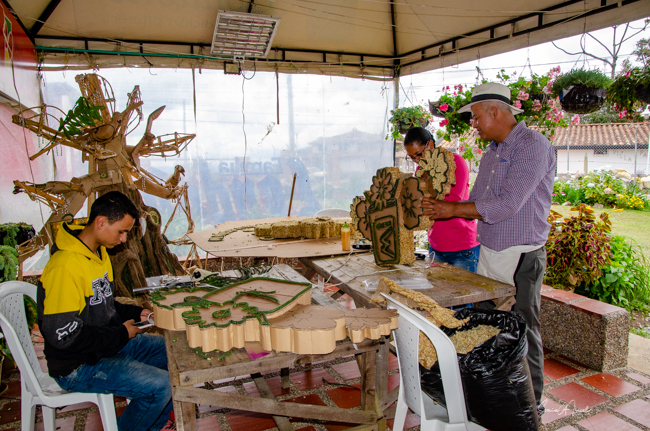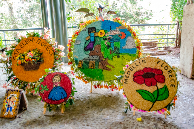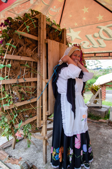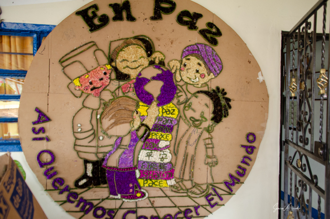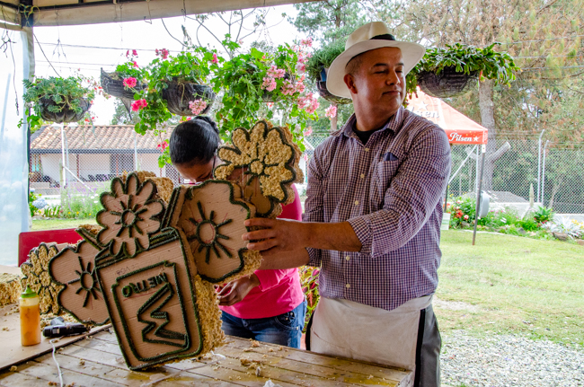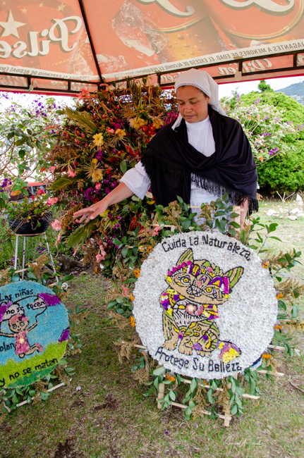 Only those born in Santa Elena who still grow flowers are allowed to participate. The techniques are passed down from generation to generation. Carmen’s two daughters, aged 7 and 4, have already begun. There is a local parade for kids one week before the official parade. Their silletas are smaller and have backpack type straps instead of head straps. The seven-year-old made a disc in white and blue flowers celebrating nature. She will participate in the main parade for the first time this August.
