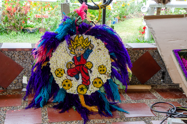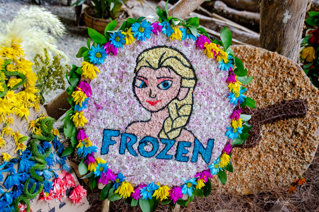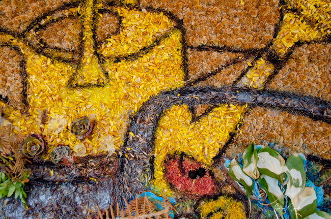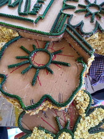 Once they decide on the design or the message, it takes 2-3 months to finish the arrangement. Other than the traditional arrangements, the rest are designed on a piece of wood, and then the flowers are glued down. Often the outline of the designs are glued down first, Then the rest is filled in. And of course, the flowers have to be fresh so they have to time it with the start of the parade. And the arrangements can be huge. One was a disk 7 feet in diameter!