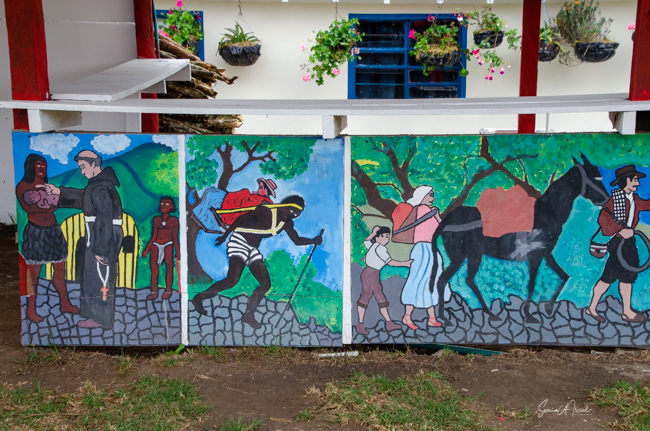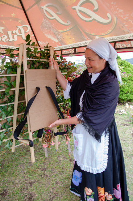 Carmen told us that they used to carry her grandmother that way. They also used to carry pregnant women from Santa Elena to Medellin to deliver their babies. Â But then the Santa Elena indigenous locals changed the packages carried in the chairs from people to flowers and changed the chair for one with no legs. They began by transporting flowers from Santa Elena to cemeteries in Medellin.