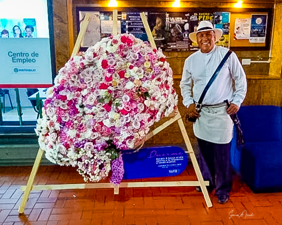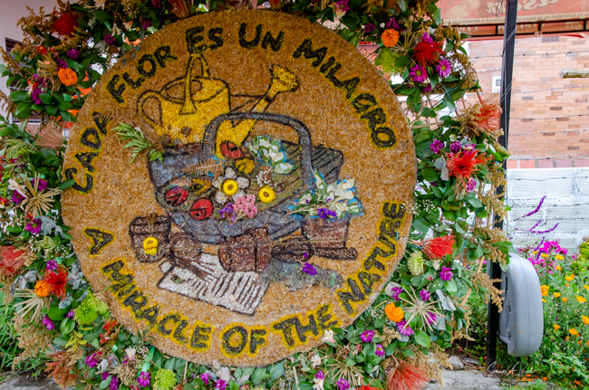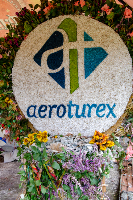 In the main festival and competition, they compete in four categories which are each judged on beauty, composition and variety of flowers. The four categories are traditional (ornate large flower arrangements), monumental (the largest one created by covering enormous circles with flowers; they can be 7 feet in diameter and they are heavy), emblematic (cultural symbols with messages) and commercial (flower arrangements with commercial logos). Between all the participants, over 600,000 flowers are used. The sillerteros also are hired for professional arrangements and offer other arrangements for sale. If you include these, there are about 1.5 million flowers used. And the oldest silletero is 86 years old!