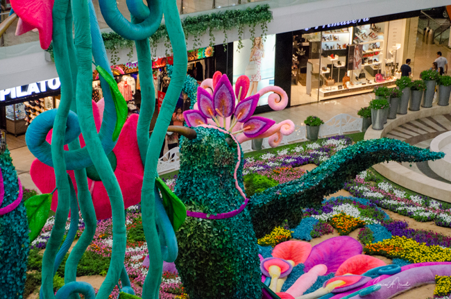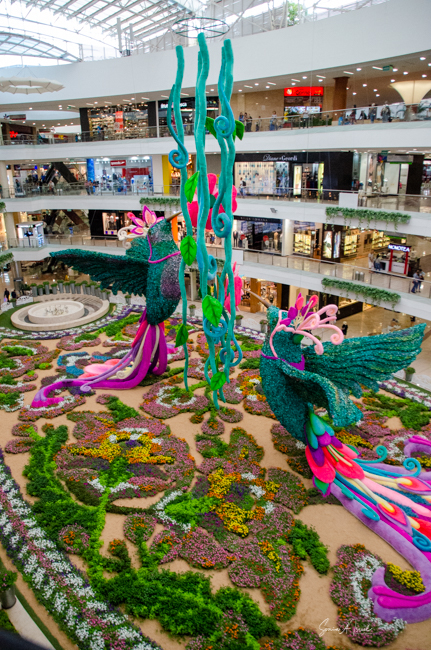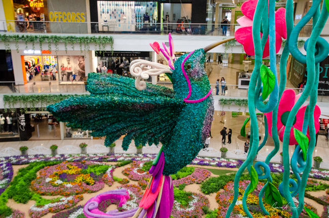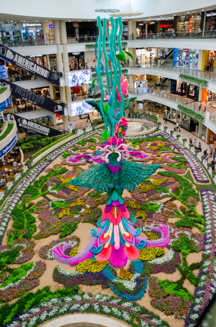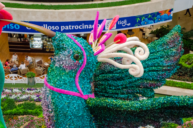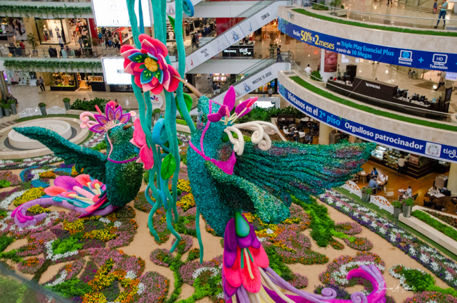 On the way back to the hotel, we were dropped off at the shopping mall, Santafé, not far from where we were staying. I had heard from someone we sat next to at dinner one night, that there was a gorgeous flower display there and I wanted to see it. And outside was a statue of a silletero. The stop was well worth it!