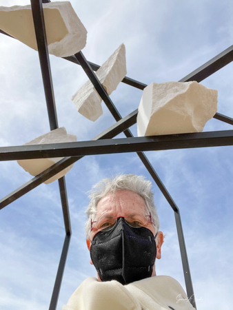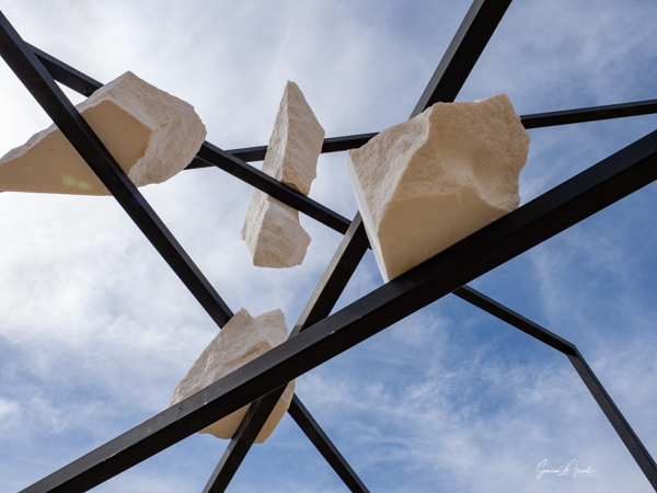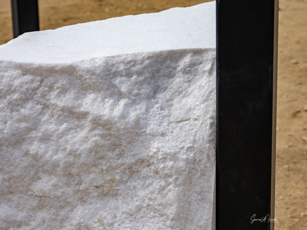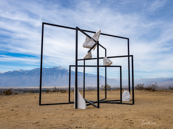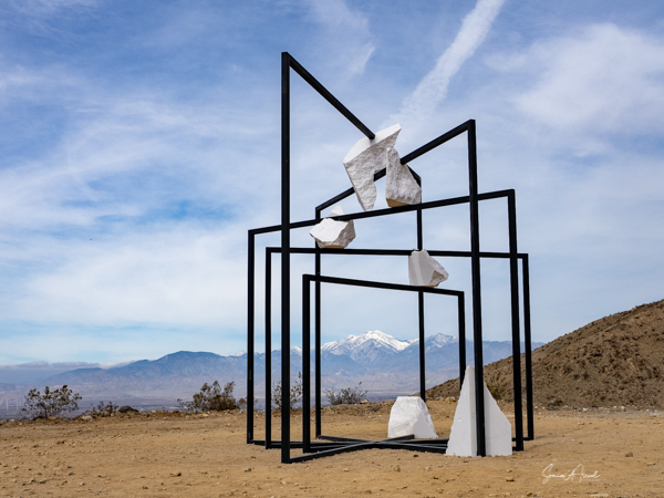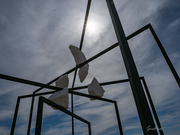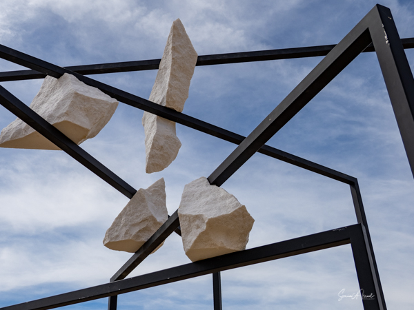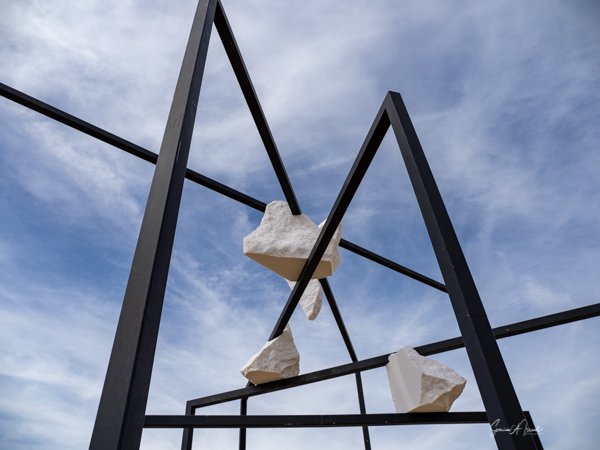 The road ended and turned into a rocky desert area but in the distance I can see the sculpture. I saw the interlocking black metal frames holding up large pieces of white marble which looked almost like ice bergs rather than like clouds. The description of this piece said, “As you approach and move in and out of its frames, you become aware of the experiential equivalent of Heisenberg’s uncertainty principle, an effect whereby observer interaction changes the form of the thing being interacted with. The result is an illusion of instability. This wobbling perception of size and relationship lies at the heart of the work, as with every step, the sculpture and its components reform into new combinations.” I did not experience this. It did not seem unstable at all. It did look beautiful with the pure white “clouds” against the very blue sky with its own set of puffy clouds. And in the distance, which you could see between the metal posts, were the snowcapped mountains.